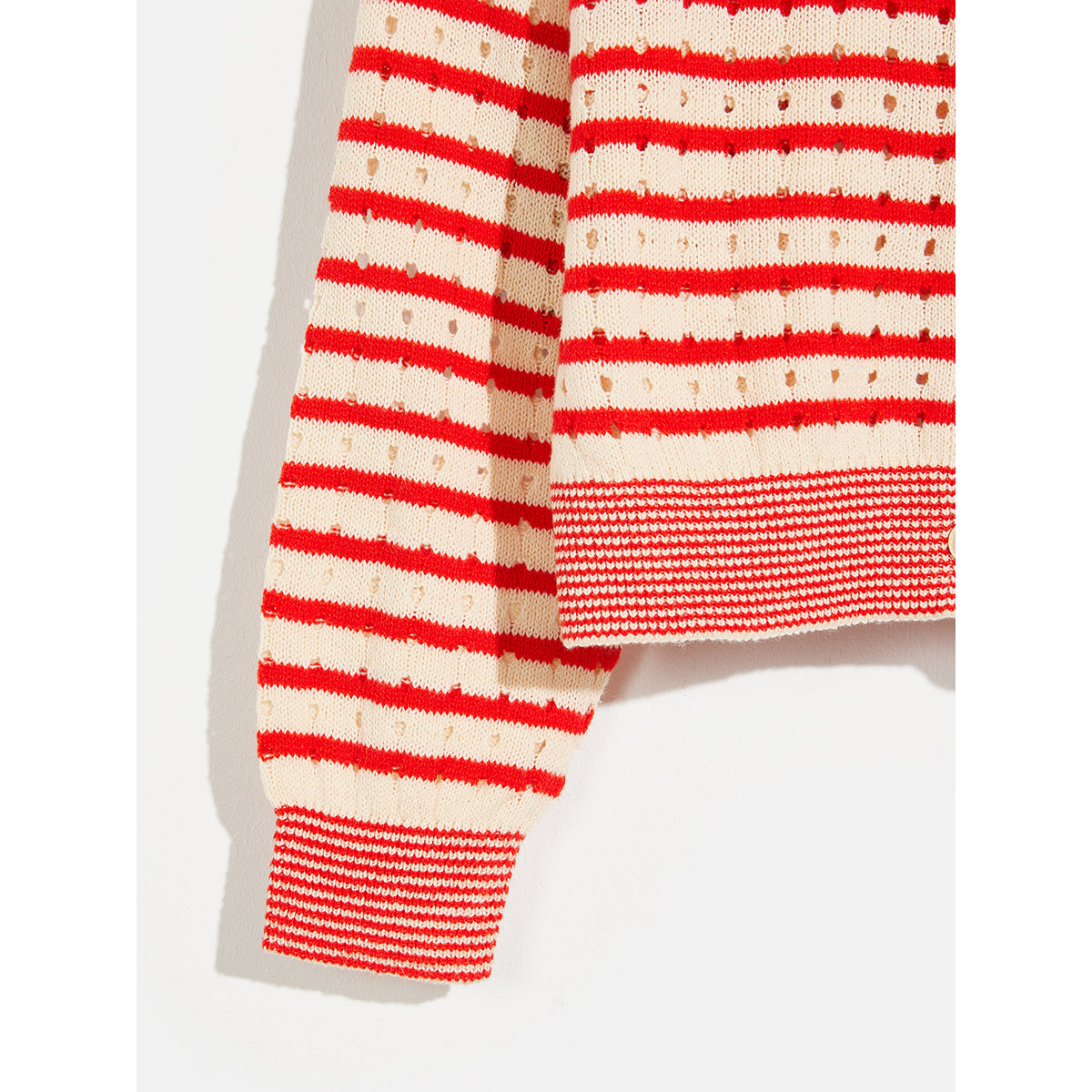 The Gello cardigan from Bellerose is a really good option for transitional weather. It's made from a light cotton blend, knit to fancy open needlework, and features red stripes all over. Its relaxed shape means that it'll layer over anything with ease. Love.