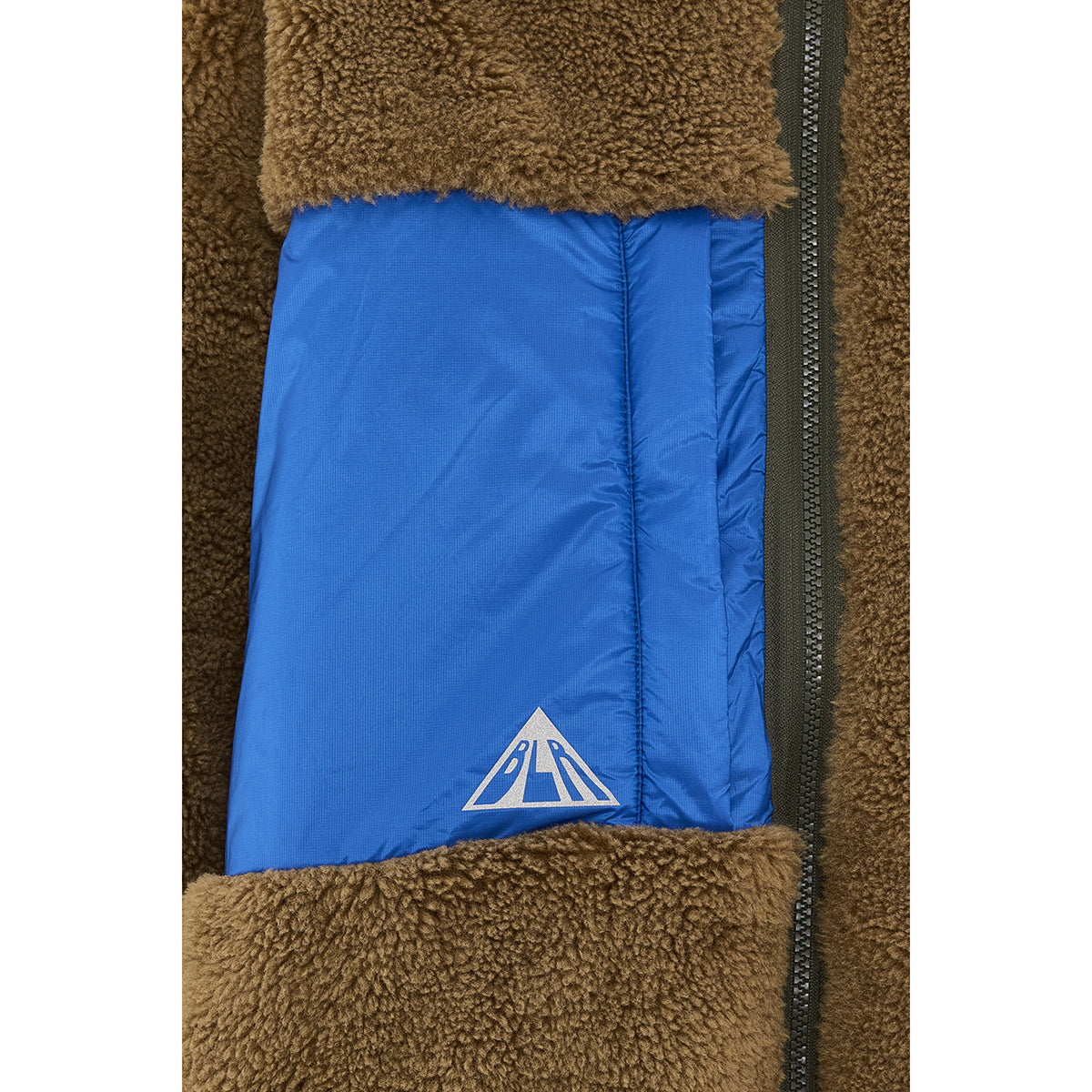 Relaxed reversible rain jacket from Bellerose with a zip-up front, an elastic waist, and a large hood. One side in olive green nylon, the other in brown teddy.