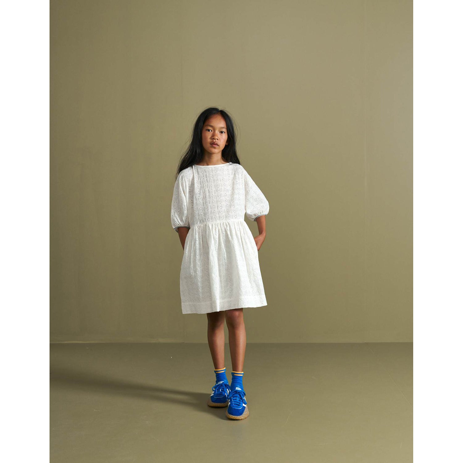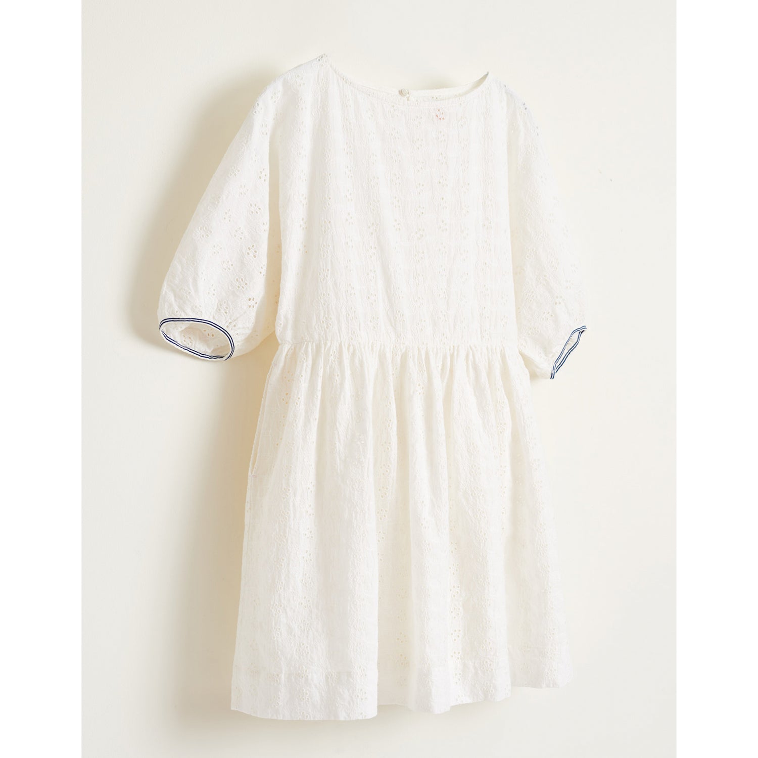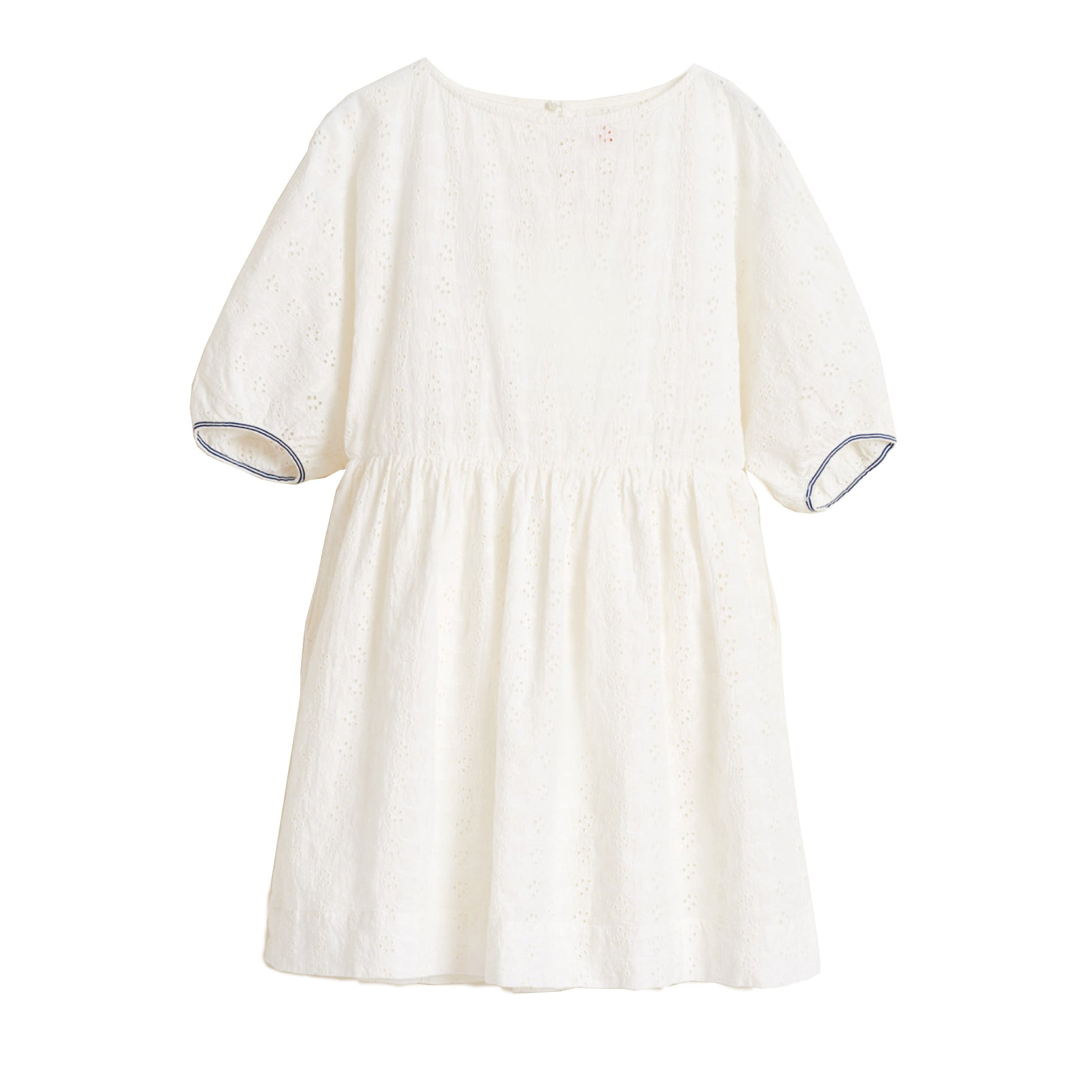 Romanticism done the Bellerose way. Our HAPPY dress takes its inspiration from vintage embroidery. The loose fit, balloon sleeves and concealed pockets make for a more modern take. She'll love to wear it for special occasions but it'll look great worn with sneakers and socks too! And if this pristine white isn't her cup of tea it also comes in a bright and bold red version. Note the contrasting striped piping at the bottom of the sleeves.