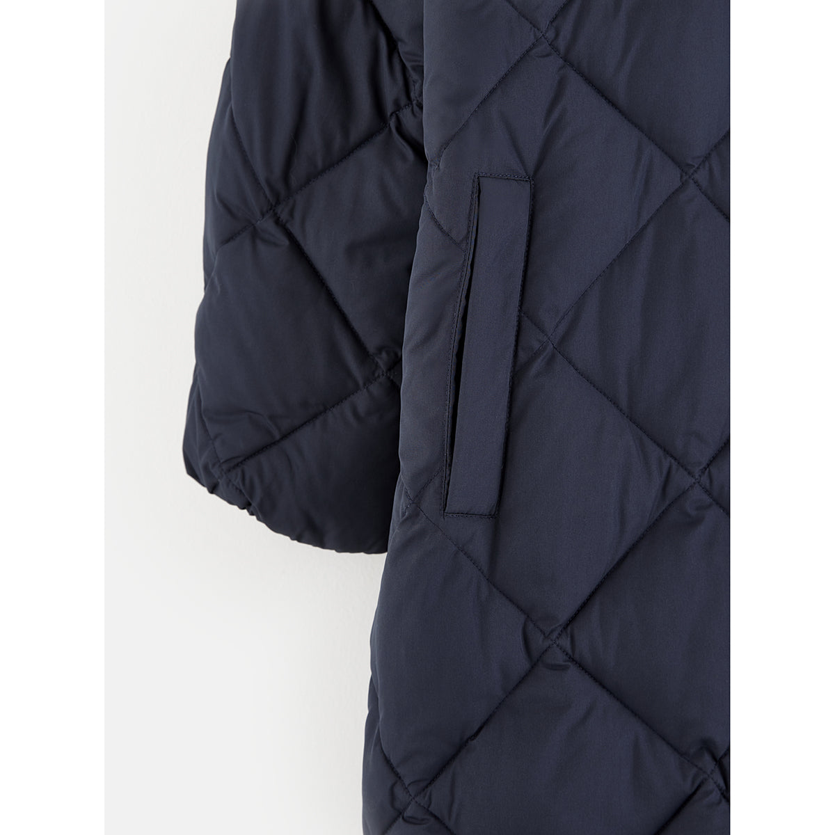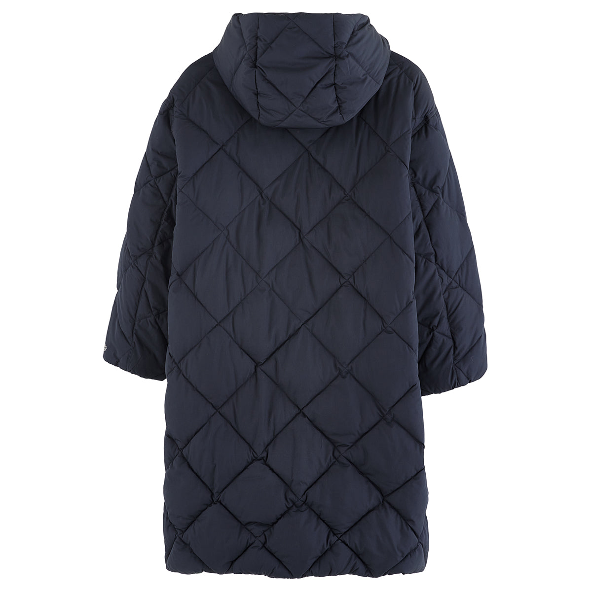 The Bellerose Harpers coat is a two-tone, padded and hooded oversized parka in navy blue.