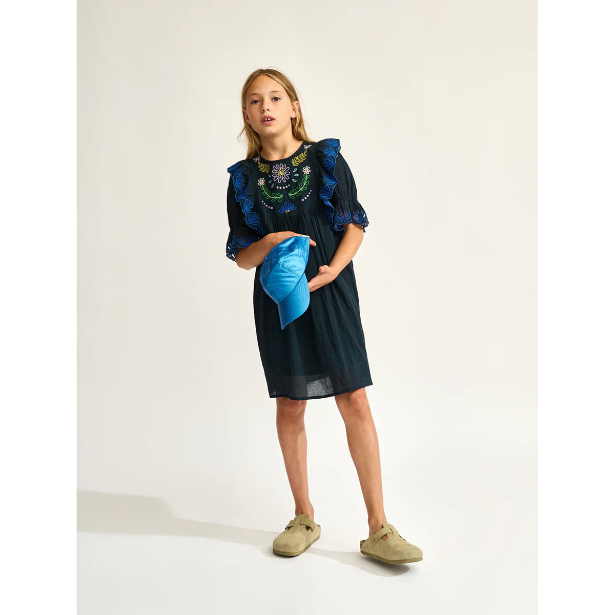 The vintage influences of Honest dress from Bellerose can't be ignored. This babydoll dress features an A-line shape with ruffled details at the sleeves and neckline. But its embroideries are definitely stealing the show with multicolour floral-inspired motifs in the front and back contrasting on the dark cotton veil.