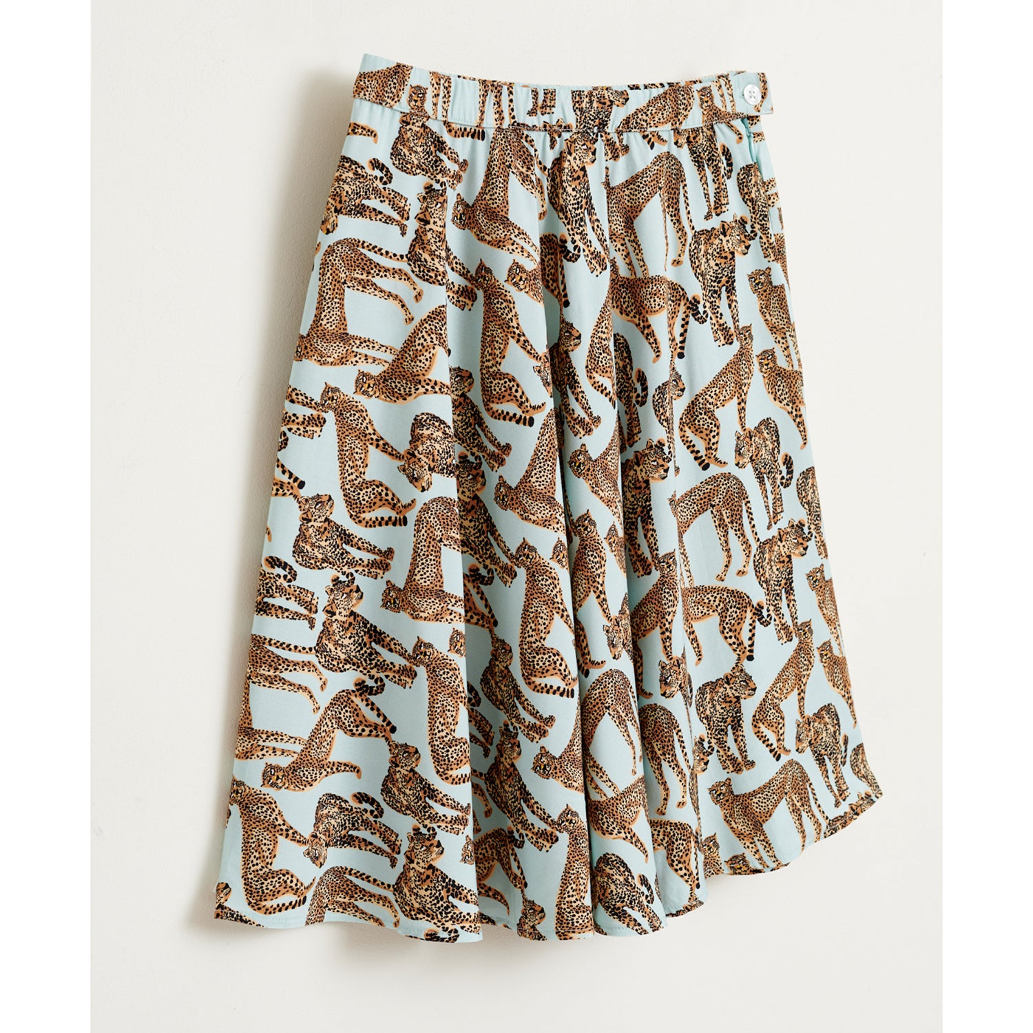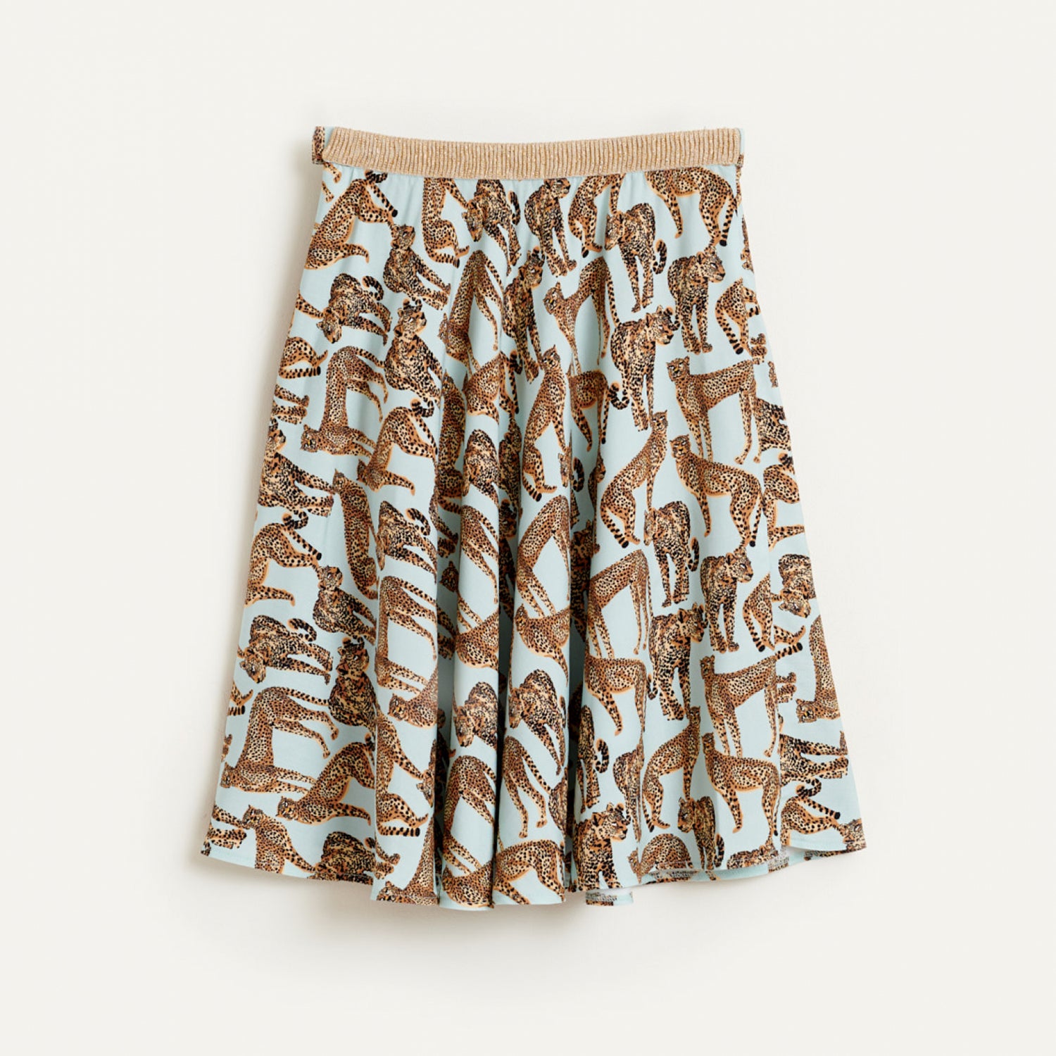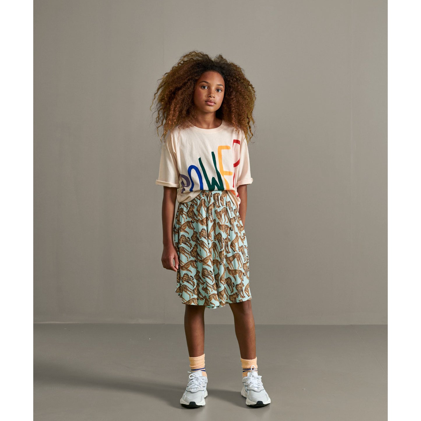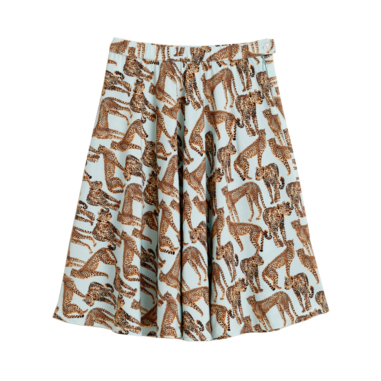 A simple skirt with a lot of personality! Our POWER skirt is a mid-length circle skirt but the thing that is so special about it is this incredible leopard print. We really took animal prints to the next level this year. Slightly elasticated at the waist with an invisible side zip and a ribbed lurex detail at the back. She'll love to wear it with a simple white tee or shirt but the pastel tone of the background can match with a lot of summery colours too! Also comes in a floral version.