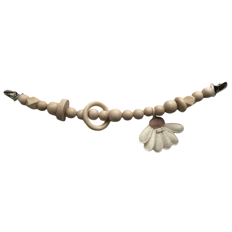 The handmade daisy daylight pram string from Bezisa is made from carefully selected materials that are safe to bite. Each item contains elements that provides hours of fun while stimulating sensory and motor development. Due to the quiet design, babies are not easily overstimulated and it is also possible for the babies to sleep peacefully without having to remove the pram string. The colours and shapes that Bezisa use and the serene sound of wood increases the playing pleasure but is also soothing. Each pram string is designed with care.