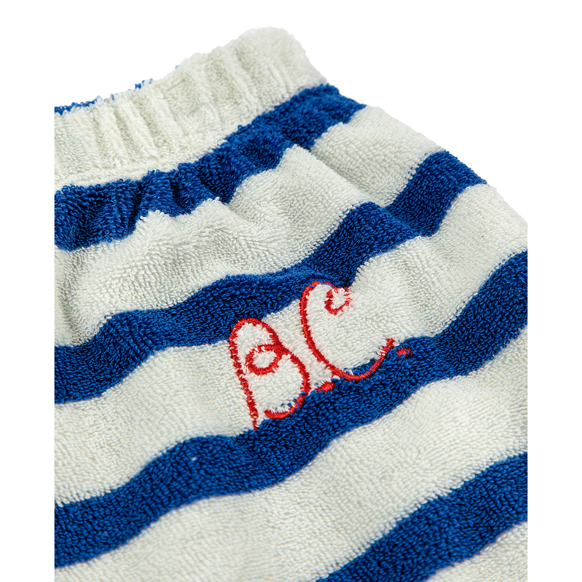 Sweet white and blue stipes bloomer trousers from Bobo Choses. Designed with elasticated waistband, ribbed cuffs and embroidery.