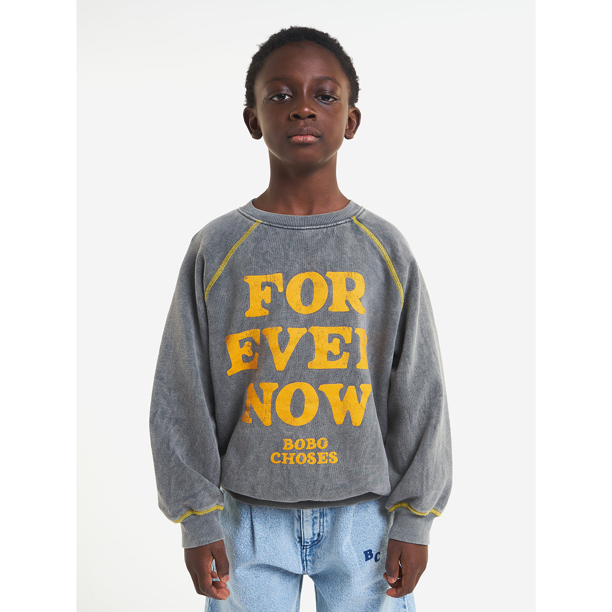 A comfy sweatshirt with a yellow 'FOREVER NOW' front print from Bobo Choses for toddlers and kids.