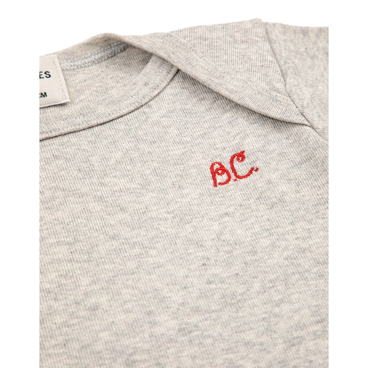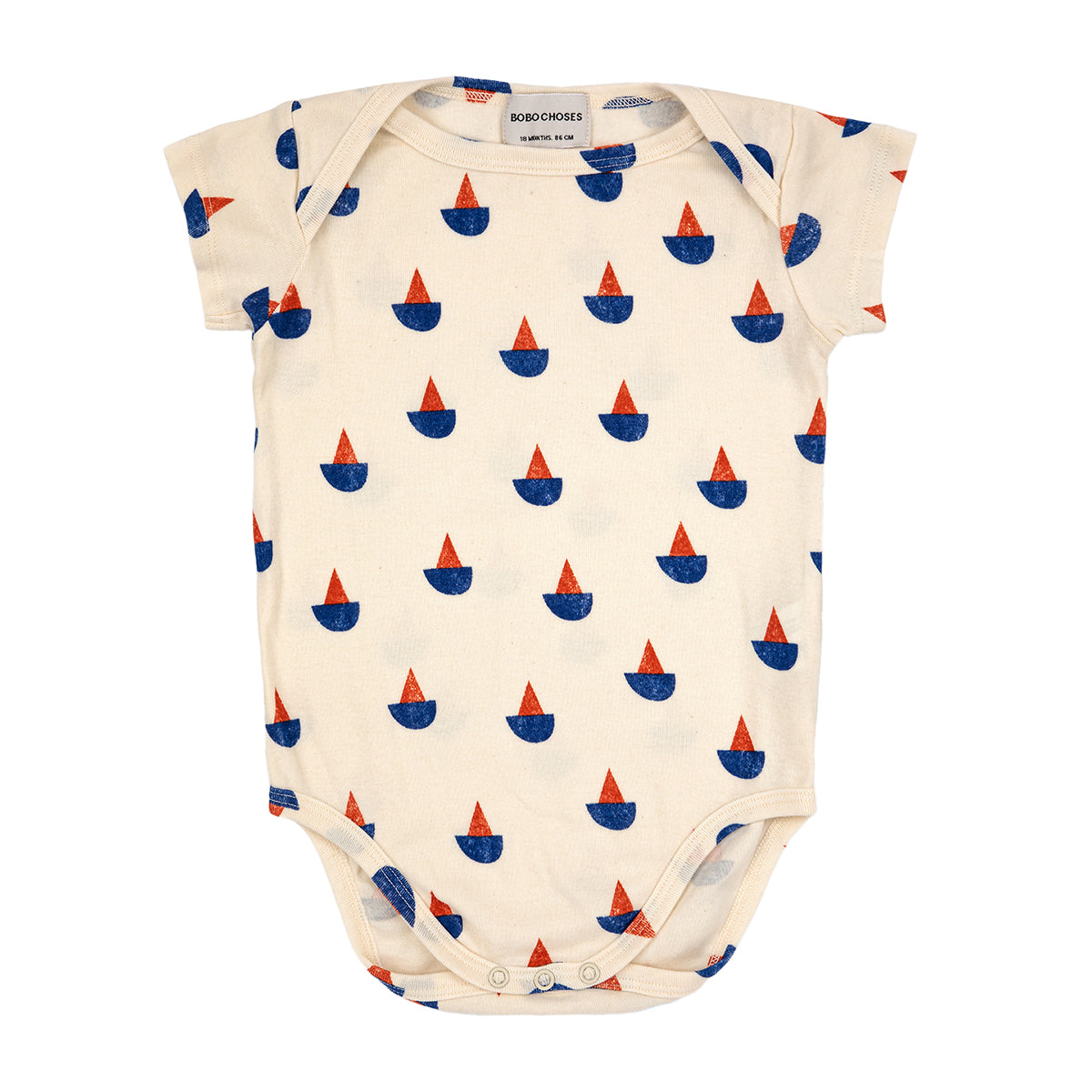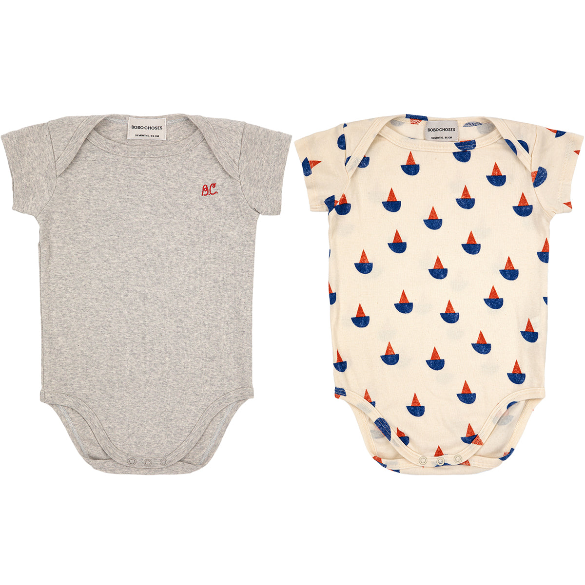 A set of two adorable short-sleeved bodies from Bobo Choses. One body with a sail boat all over print and one body in grey with a small red 'B.C.' embroidery.