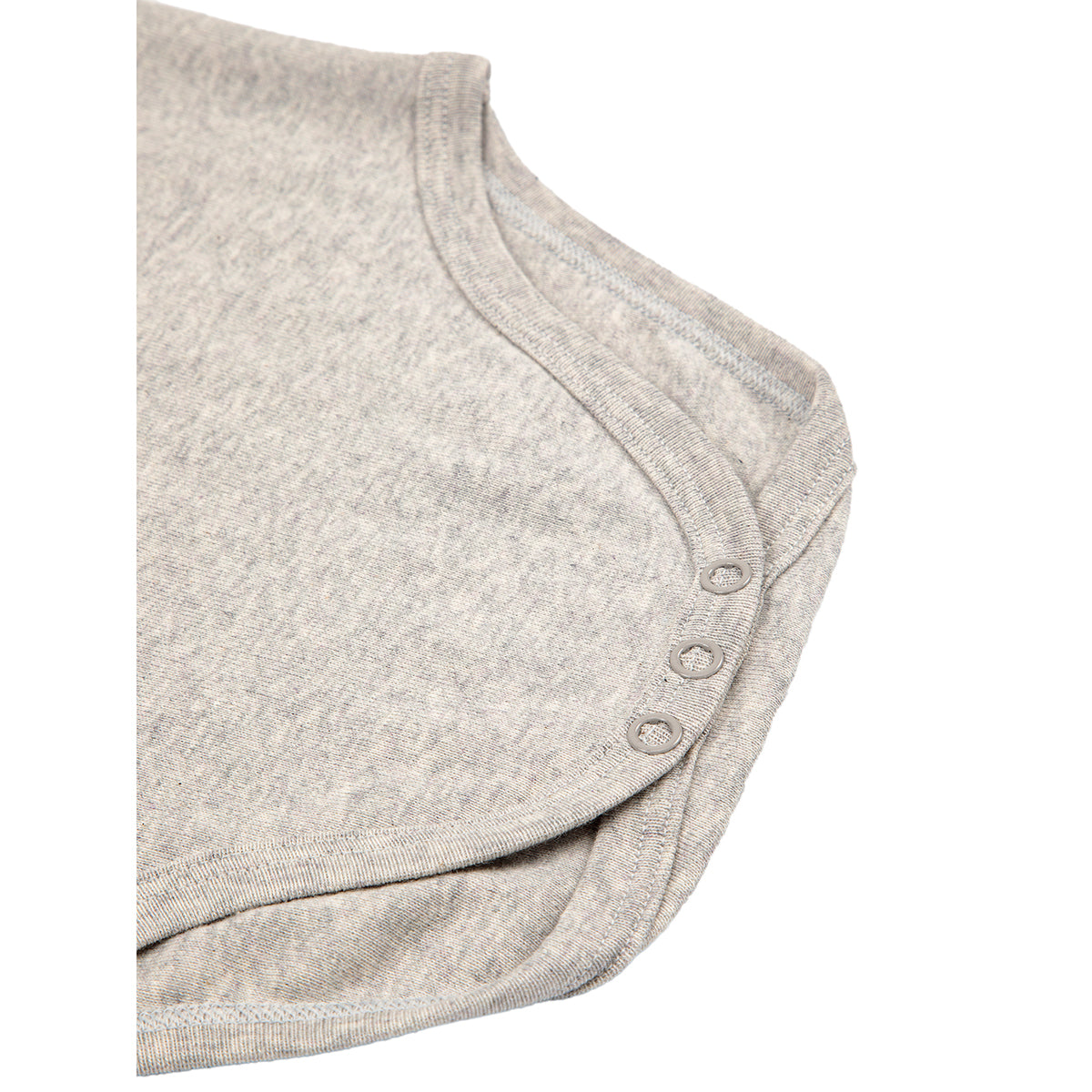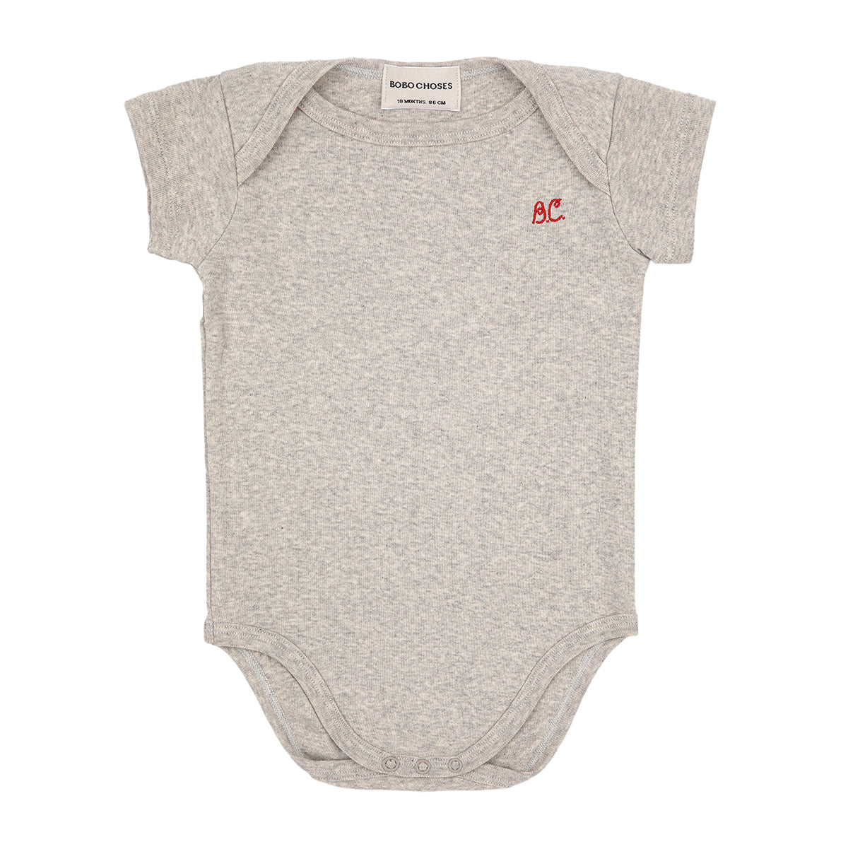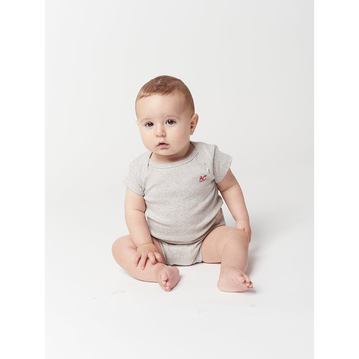 A set of two adorable short-sleeved bodies from Bobo Choses. One body with a sail boat all over print and one body in grey with a small red 'B.C.' embroidery.