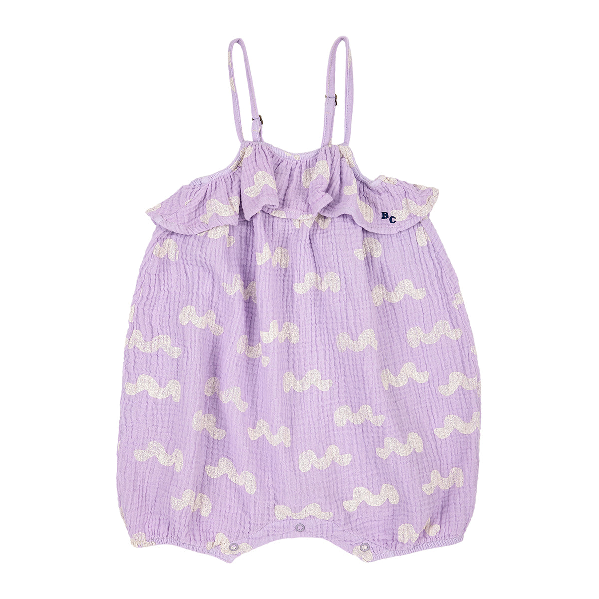 100% organic cotton lavender romper playsuit from Bobo Choses. Designed with adjustable straps, crotch snap fastening, embroidery and ruffled detailing.
