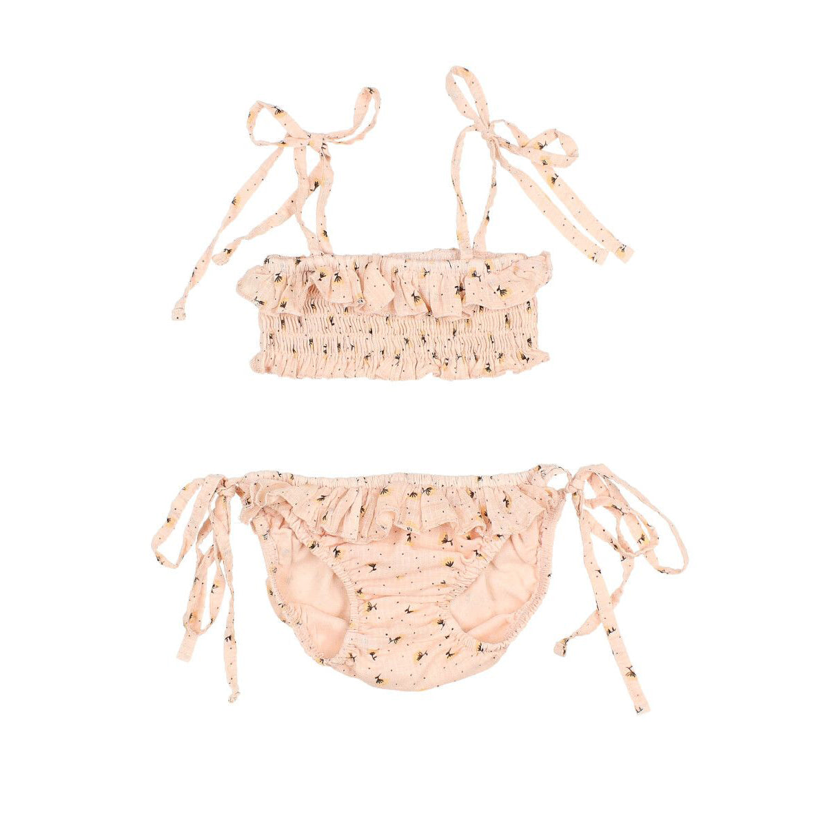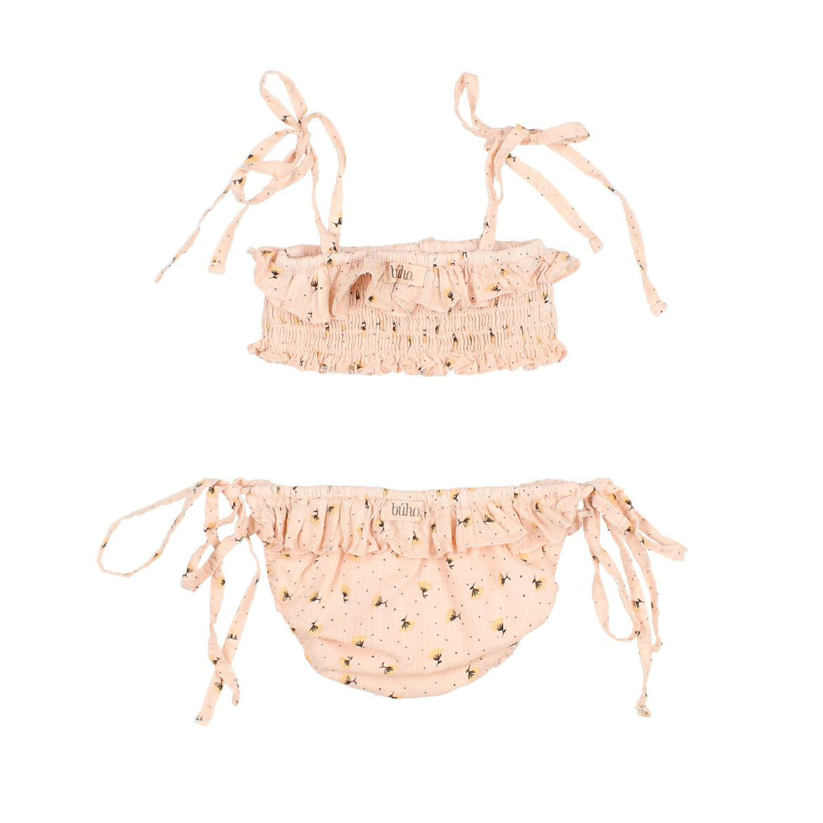 Details: Floral print | Smocked ruffled bandeau top | shoulder ties | Ruffled elastic waistline | Ties on side |