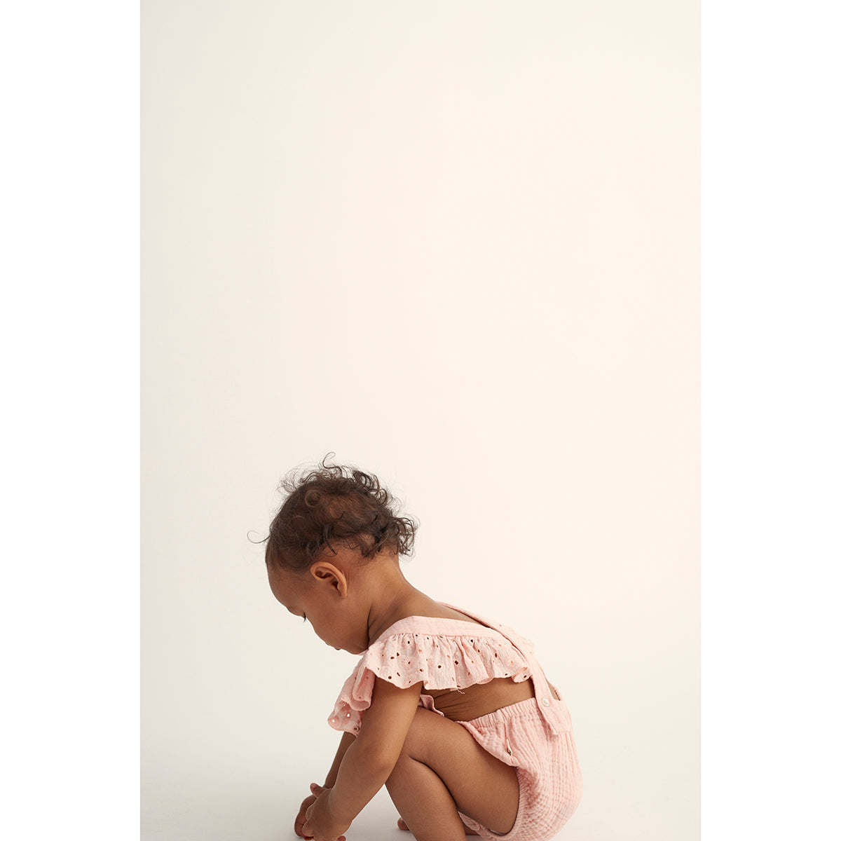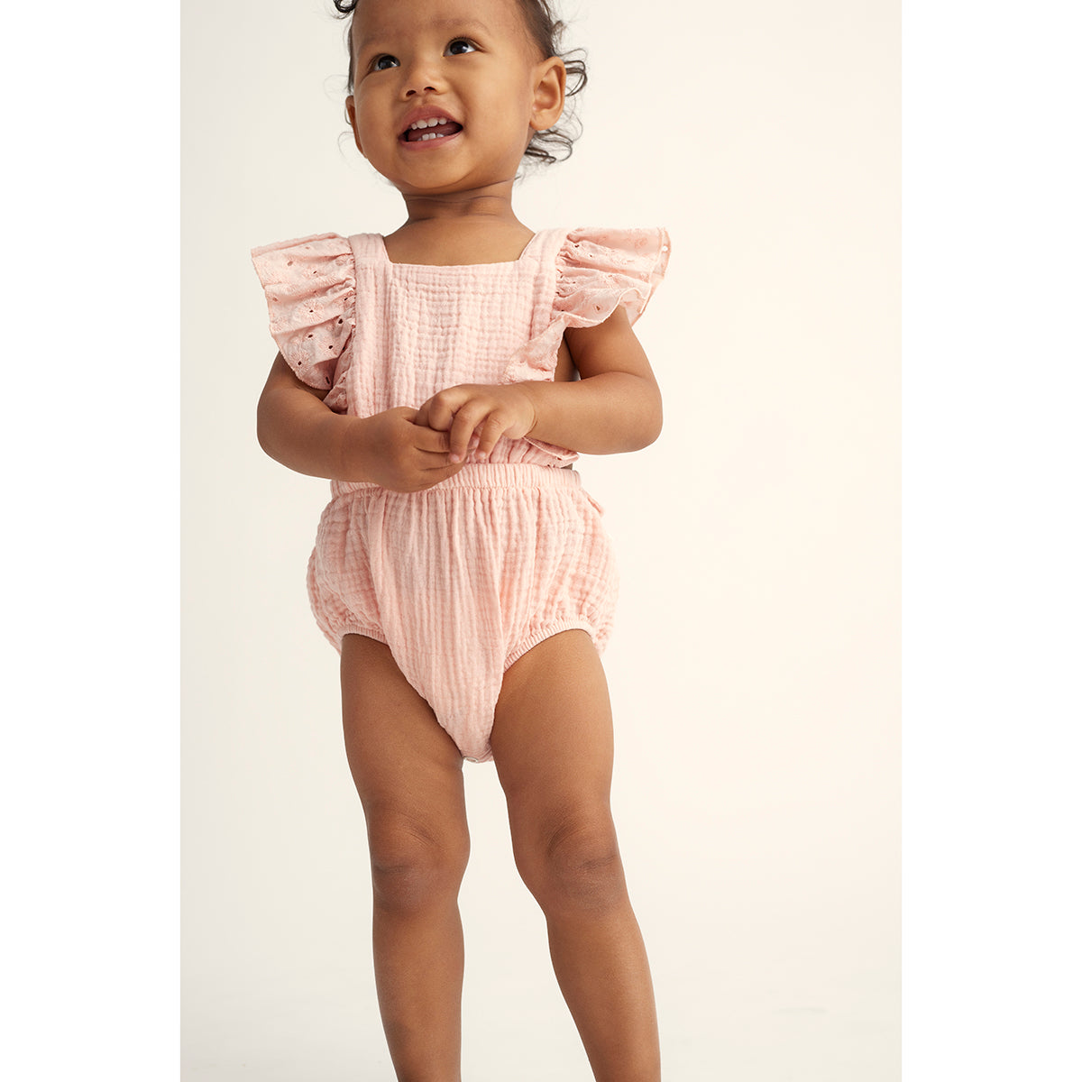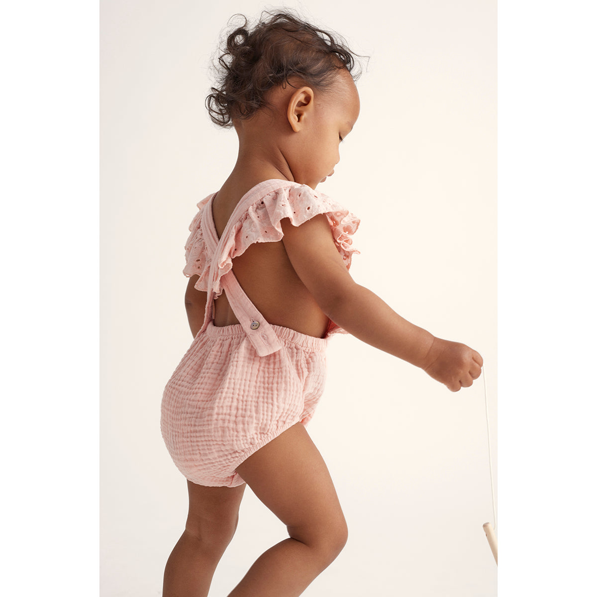 Elevate your little one's wardrobe with this enchanting Ayla romper from Cozmo. Crafted from fluffy, light cotton gauze, this romper is as dreamy as a cloud and perfect for every adventure. Its straight neckline and flutter sleeves adorned with charming Swiss embroidery add a touch of whimsy to her playful spirit. The crisscross straps at the back feature adjustable buttons for that perfect fit—because we know how fast they grow!