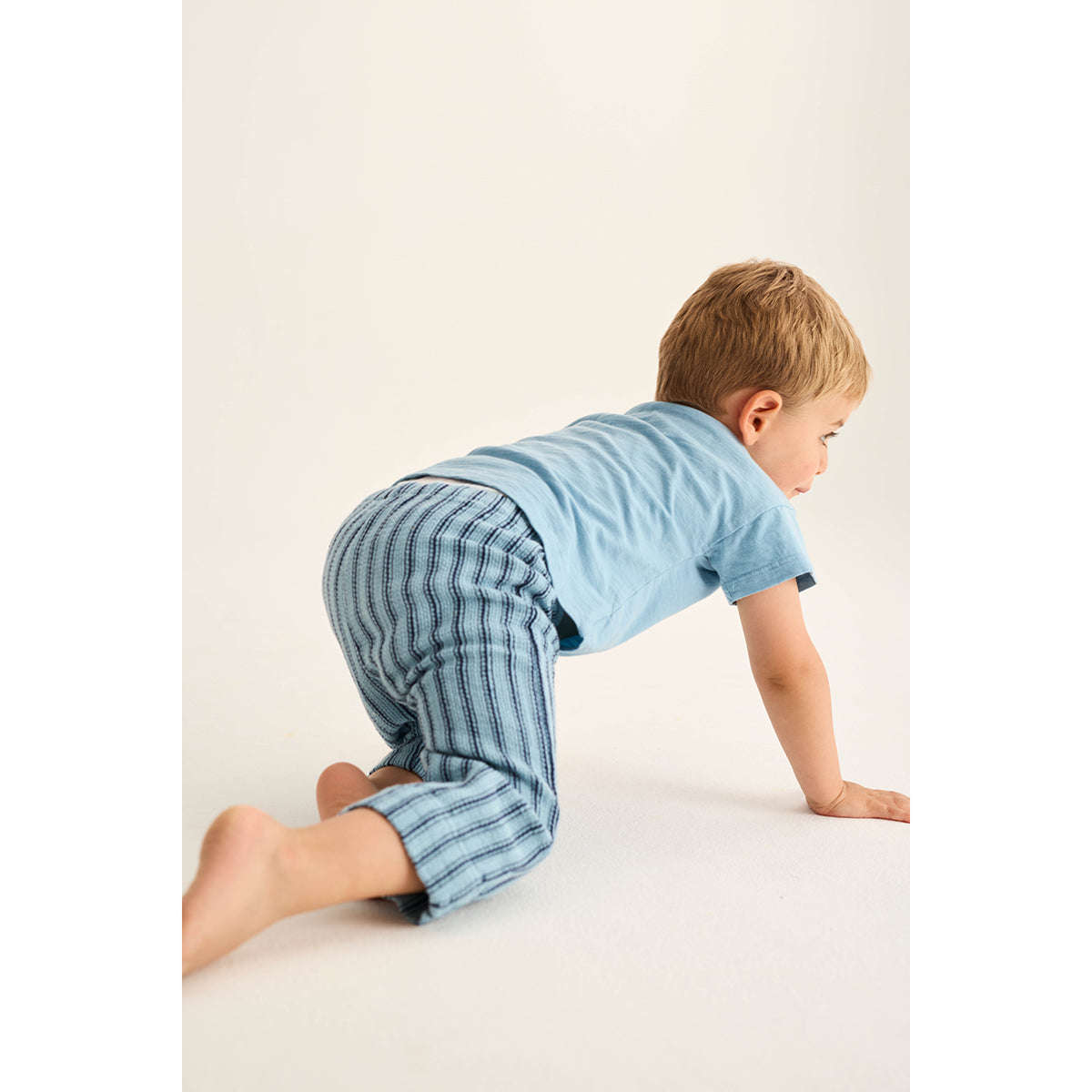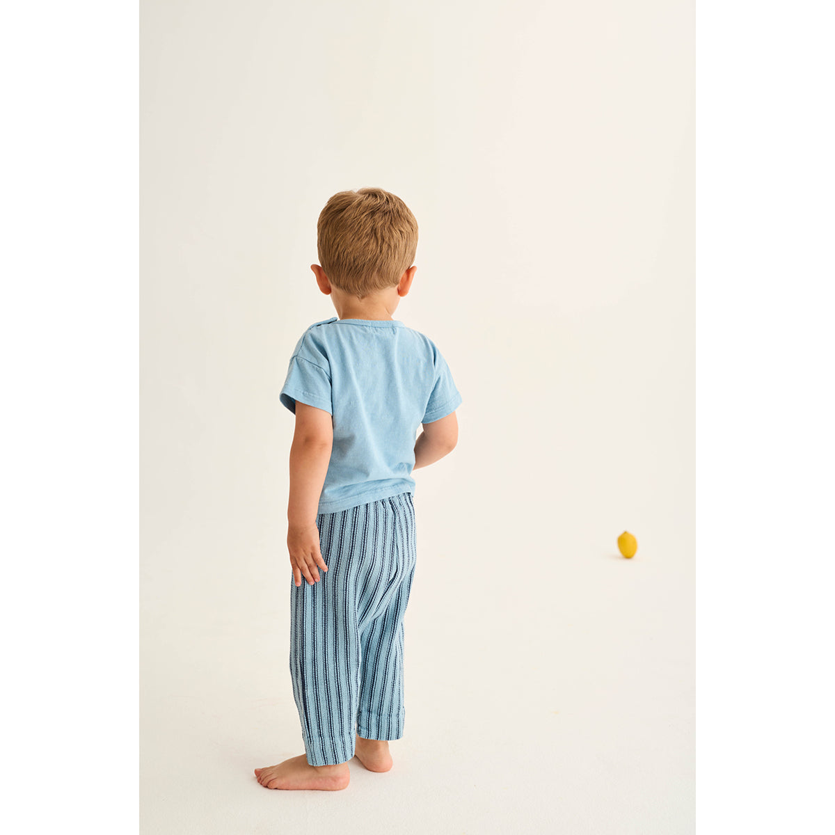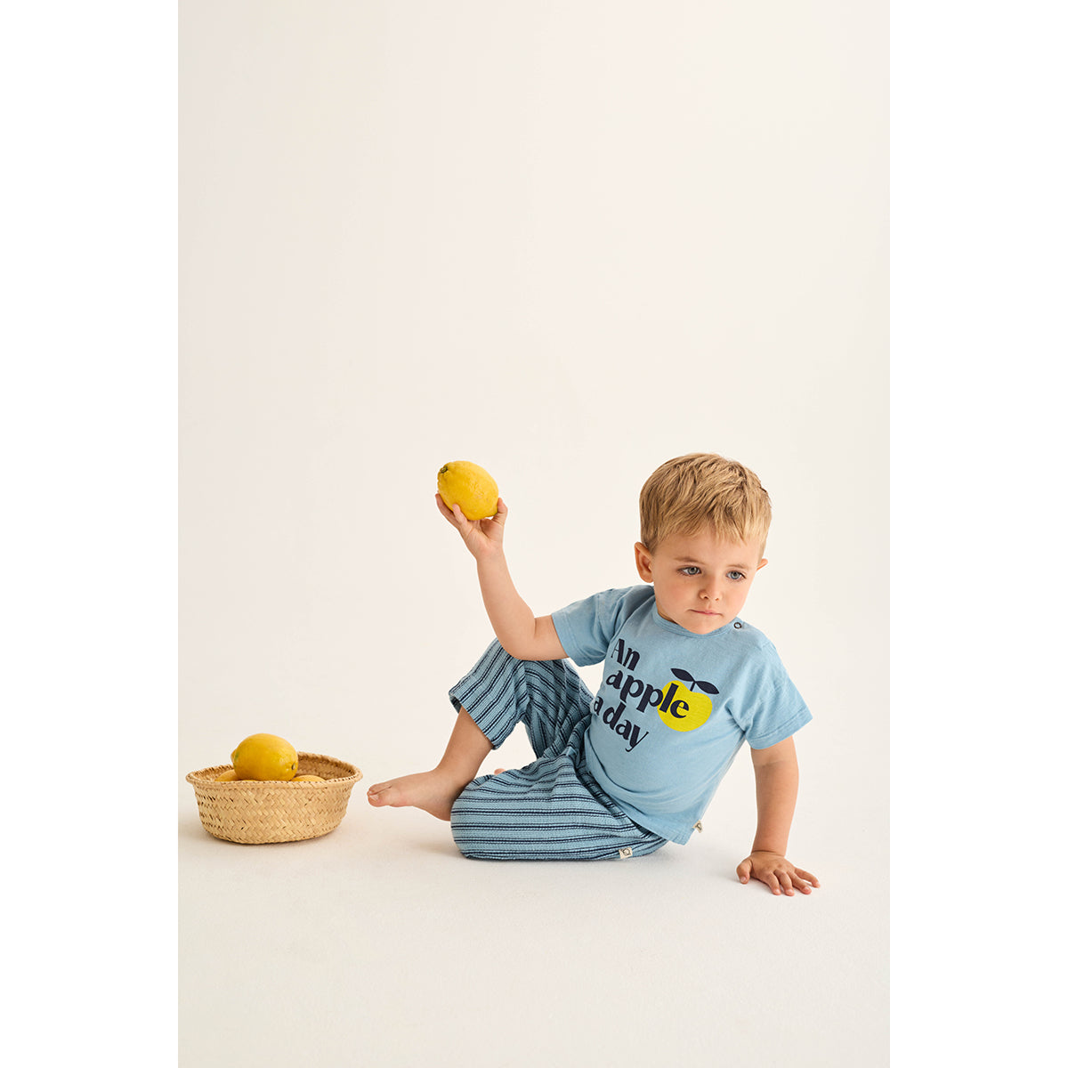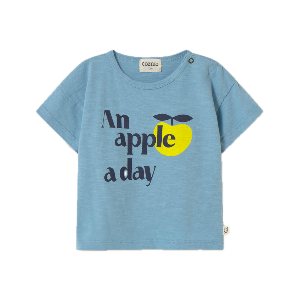 Baby boys’ T-shirt made from very lightweight slub cotton. It features a round neckline with snap buttons on the left shoulder, short sleeves and a printed motif in the front.