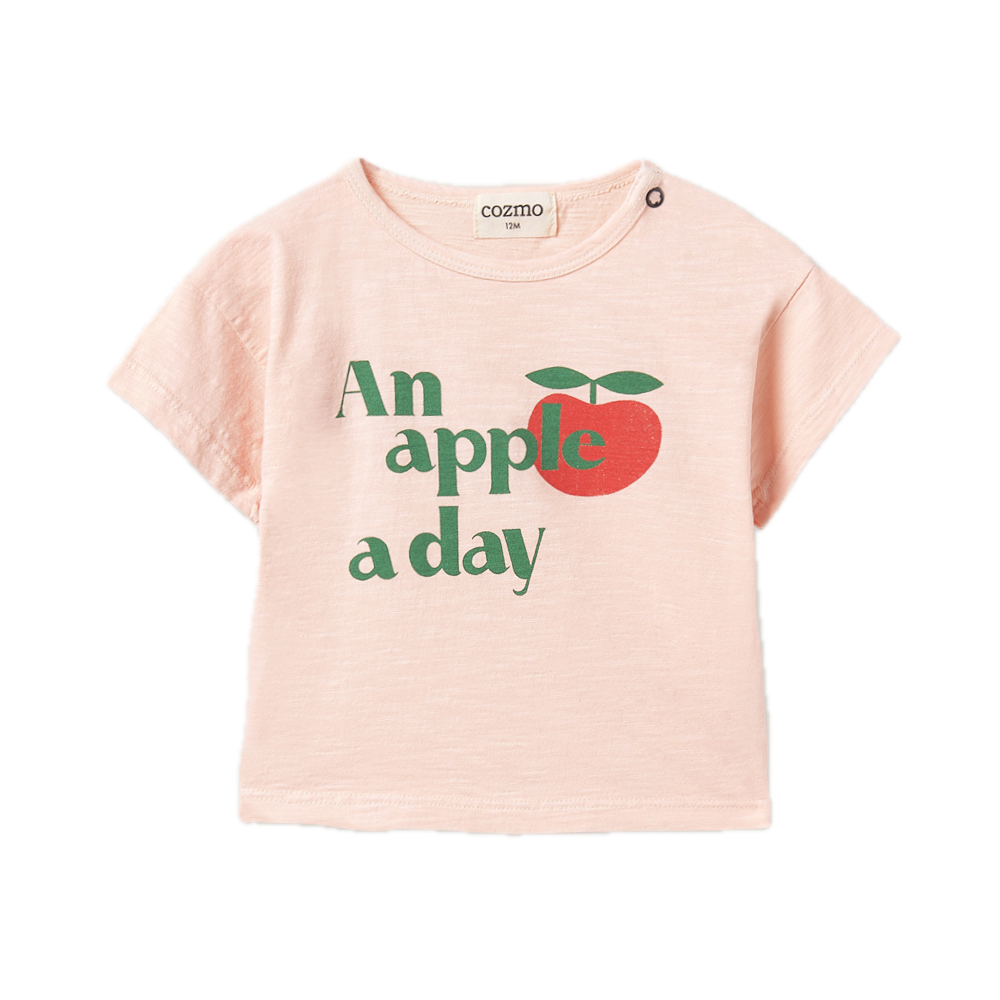 Baby boys’ T-shirt made from very lightweight slub cotton. It features a round neckline with snap buttons on the left shoulder, short sleeves and a printed motif in the front.