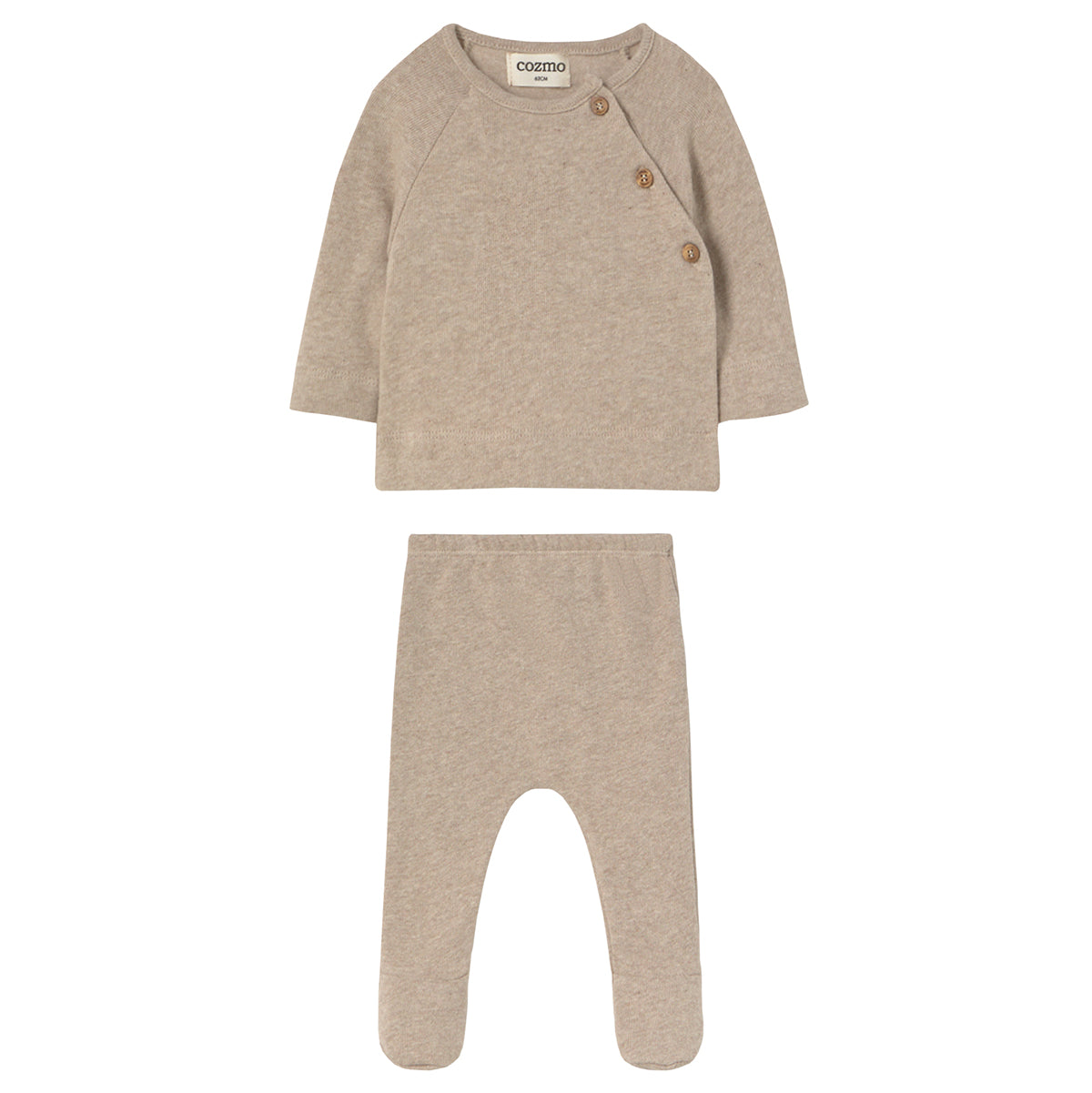 Two-piece newborn set form Cozmo featuring a wrap-over cardigan and matching footed trousers in buttery-soft knit. Both pieces are brushed inside and out for exceptional warmth and comfort, keeping your baby cozy all day long.