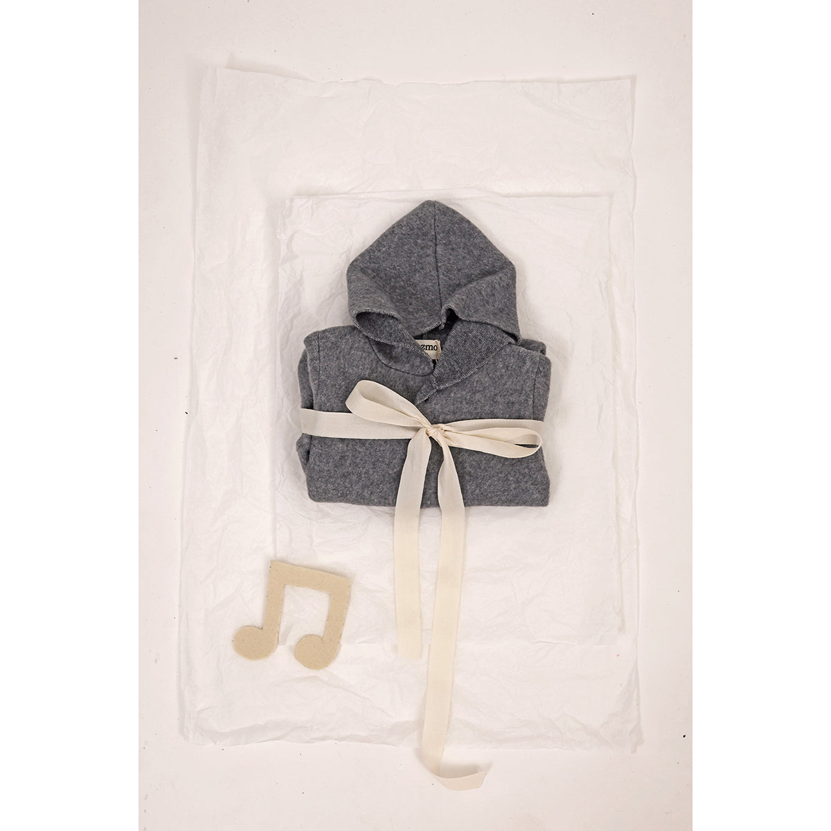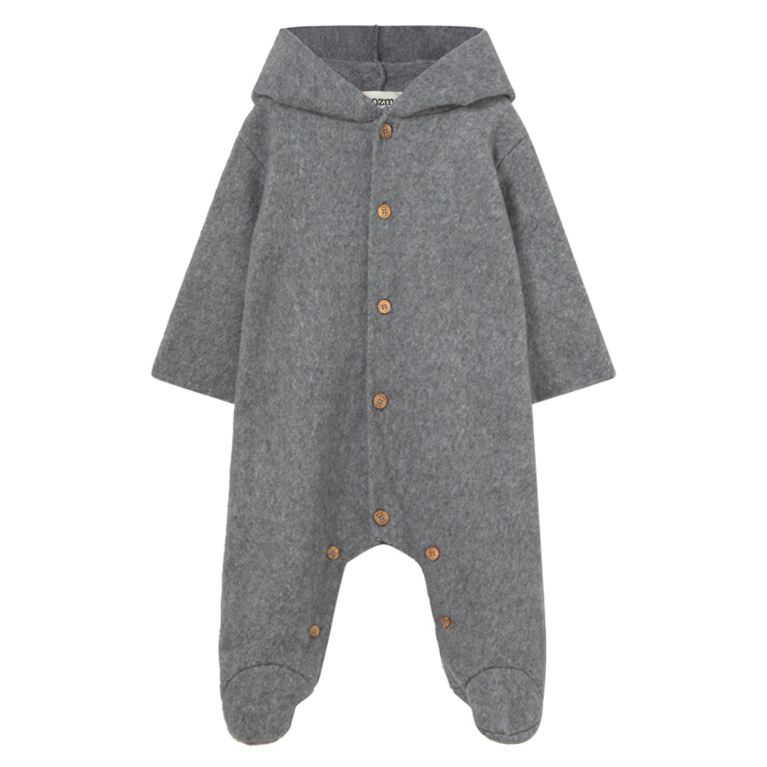 This hooded bearsuit from Cozmo is crafted from tender bamboo fabric with a soft mélange effect, designed for newborns and babies. Featuring convenient buttons down the front and along the footed legs, it ensures easy dressing and changing while providing gentle warmth and comfort.
