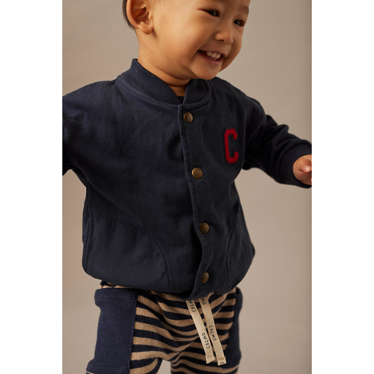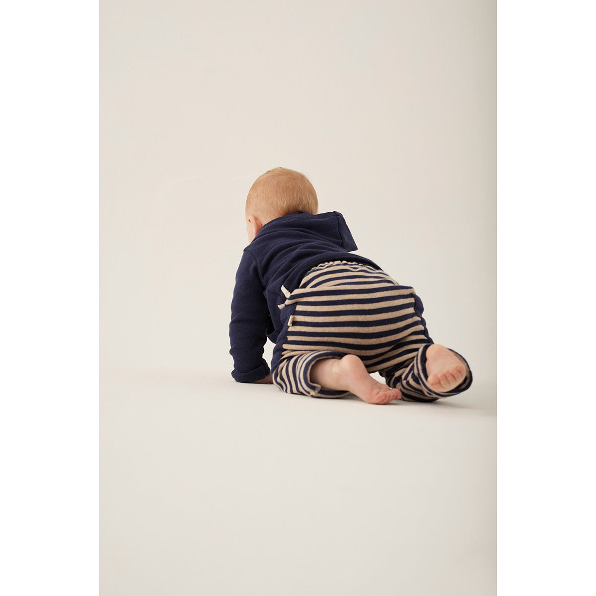 Striped baby trousers from Cozmo in soft knit, brushed inside and out for extra warmth and a pleasant feel. Designed with an elastic waistband and a decorative drawstring in a solid colour for added contrast. Featuring practical patch pockets on the legs and rolled-up hems for a laid-back, cozy look. A warm and comfortable essential for cooler days.