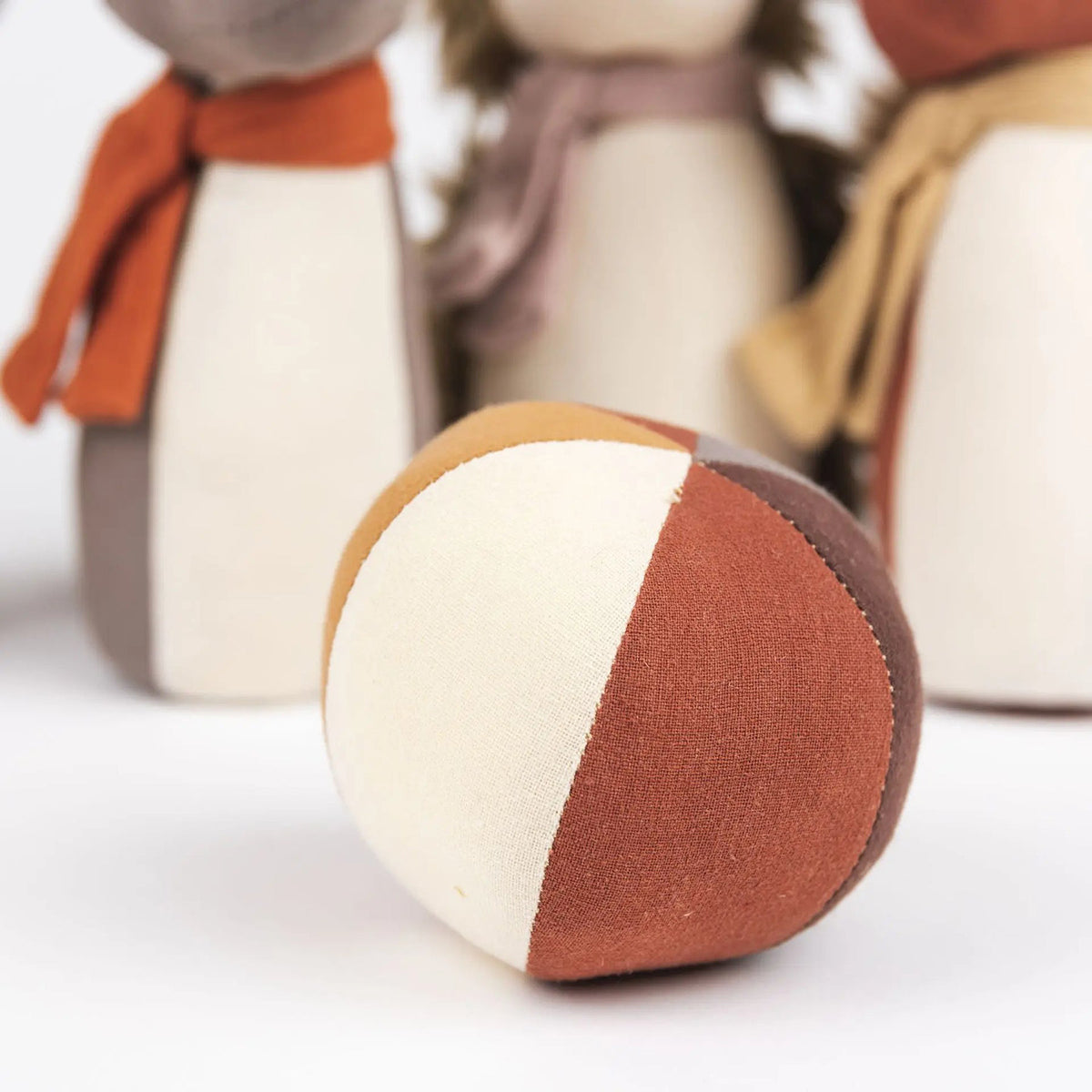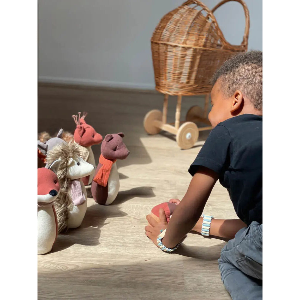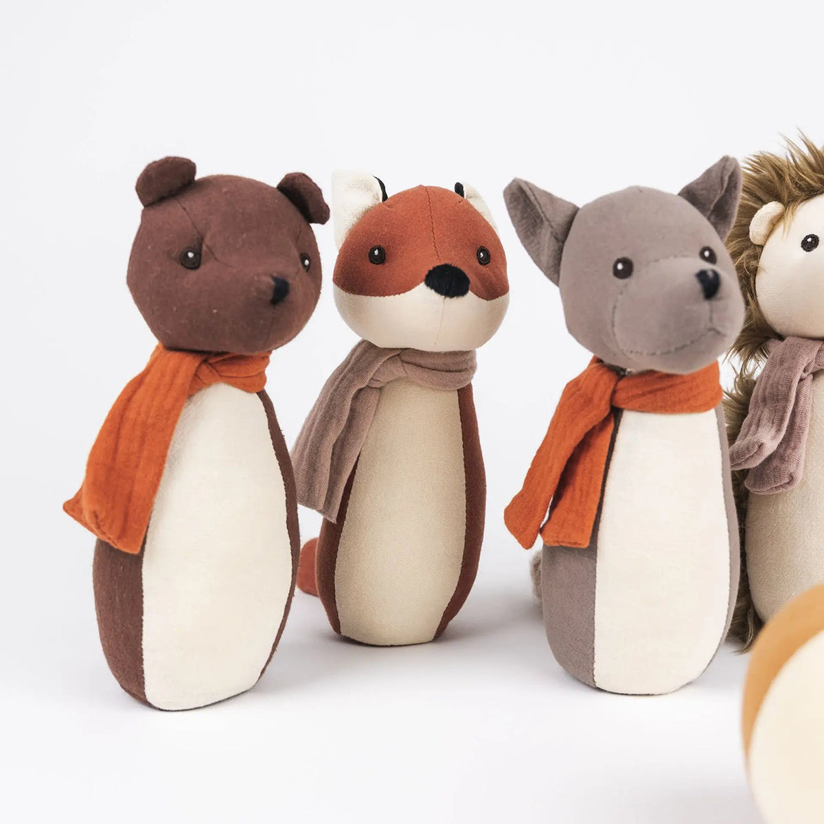 Roll the soft ball and watch five adorable forest friends tumble down! Each plush pin rattles gently as it falls, turning your living room into a woodland bowling alley.