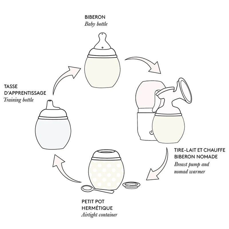 The Élhée bottle can be transformed into a small airtight container thanks to the lid supplied with the bottle. Ideal for storing breast milk or purées/compotes. It can also be transformed into a water bottle by replacing the teat with the Élhée leak-proof suction spout.
