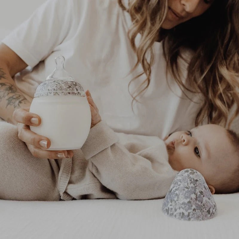 Feeding bottle from Élhée supplied with flow teat (M). The anti-colic birth bottle designed for newborns. The semi-rigid texture of the soft medical silicone bottle and the anti-colic valve are integrated into the nipple and its small 150ml size prevent the baby from swallowing too much air, minimising the risk of colic, a well-known problem among infants. It's also adaptable, with a lid that allows it to be transported hermetically sealed or transformed into a small container for storing breast milk or compotes.
