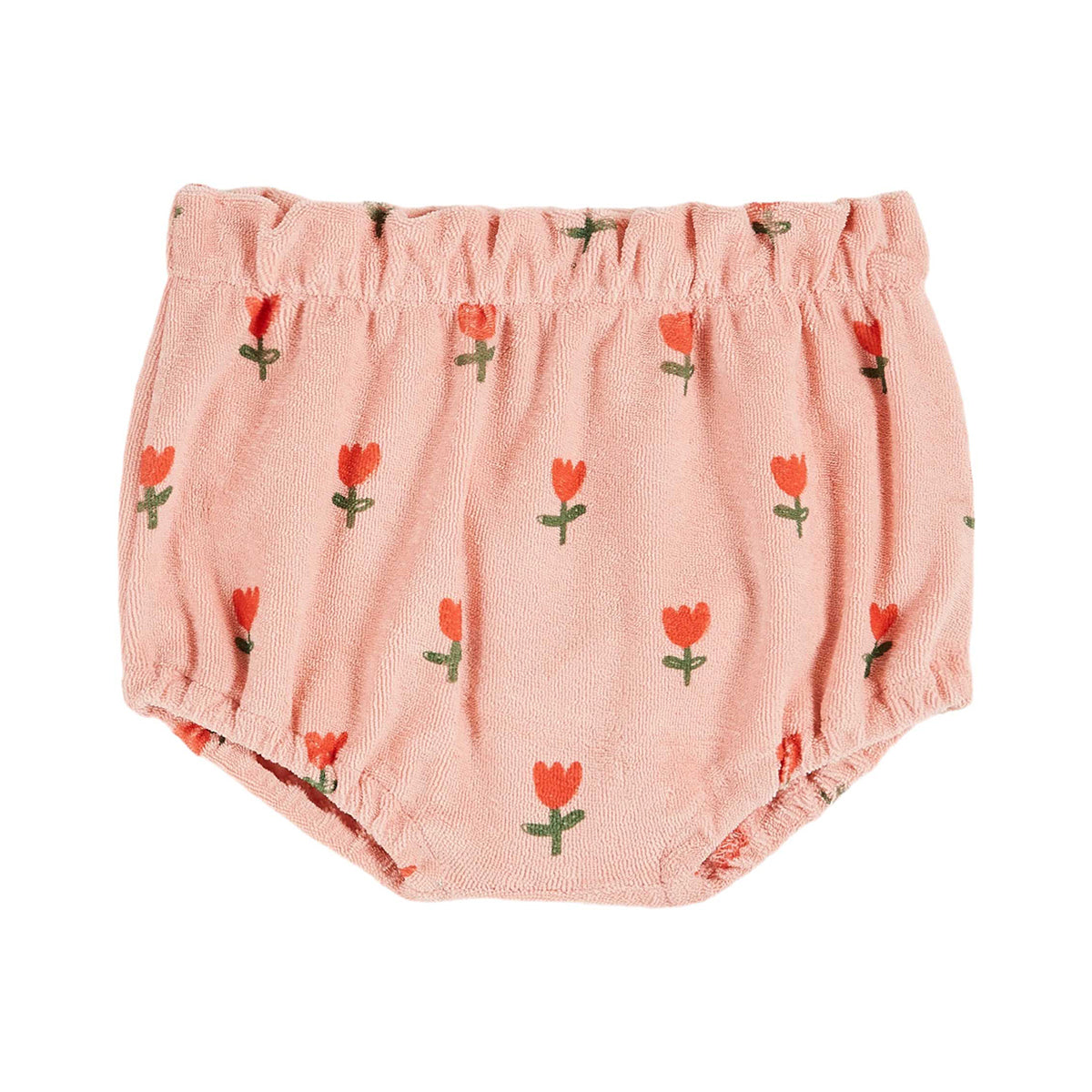 Pink cotton jersey bloomers from Emile Et Ida with red tulips. The soft and fluffy cotton and polyester blend ensures comfort and stretch. With an elasticated waist and elasticated thighs, this style offers a comfortable and flexible fit.