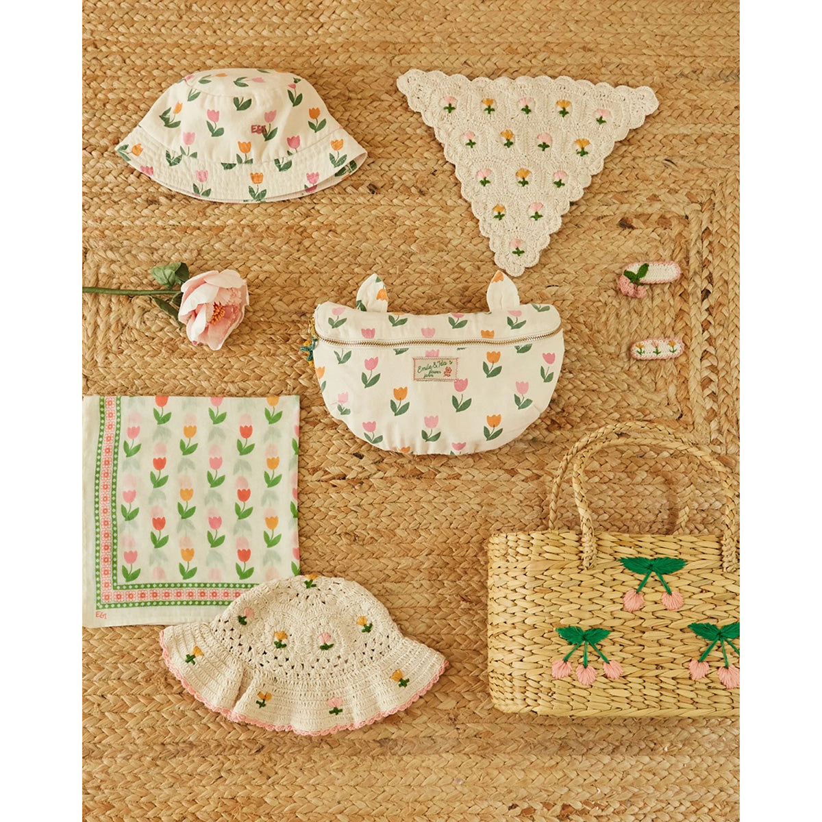 Natural wicker basket embroidered with pink cherries. Perfect size for a small picnic or a trip to the market. Transport flat items with ease thanks to its wide base.