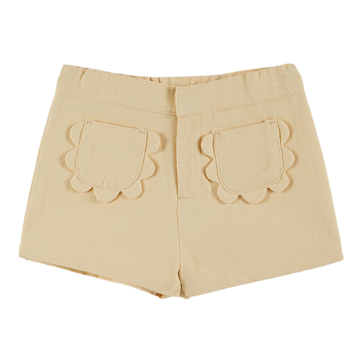 Pale yellow cotton canvas shorts from Emile Et Ida. Adjustable waist with the buttoned elastic band that slides into the waistband. There are two flower-shaped patch pockets on the front and two patch pockets on the back. The shorts have with a metal clip closure and zipper.
