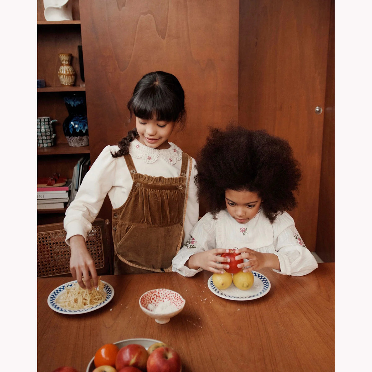 Sweatshirt in organic cotton jersey, quilted and brushed in pink. The fantasy of the sweatshirt lies in the neckline, which is bordered by an ecru crochet collar dotted with hand-embroidered pink flowers.