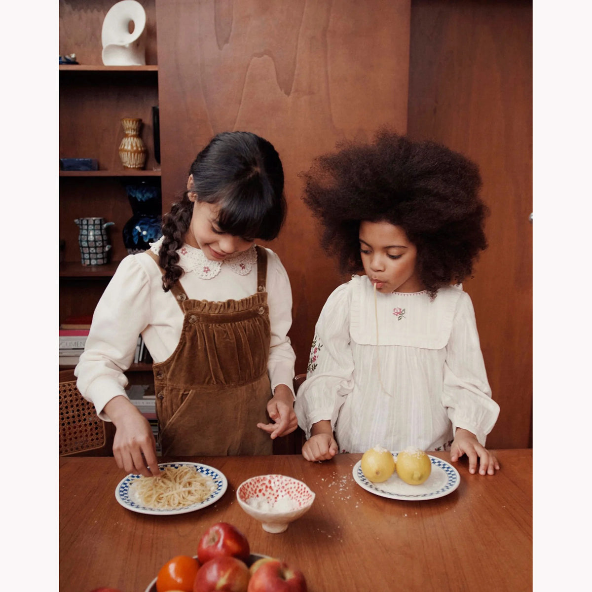 Off-white cotton blouse embroidered with pink and green floral motifs from Emile Et Ida.