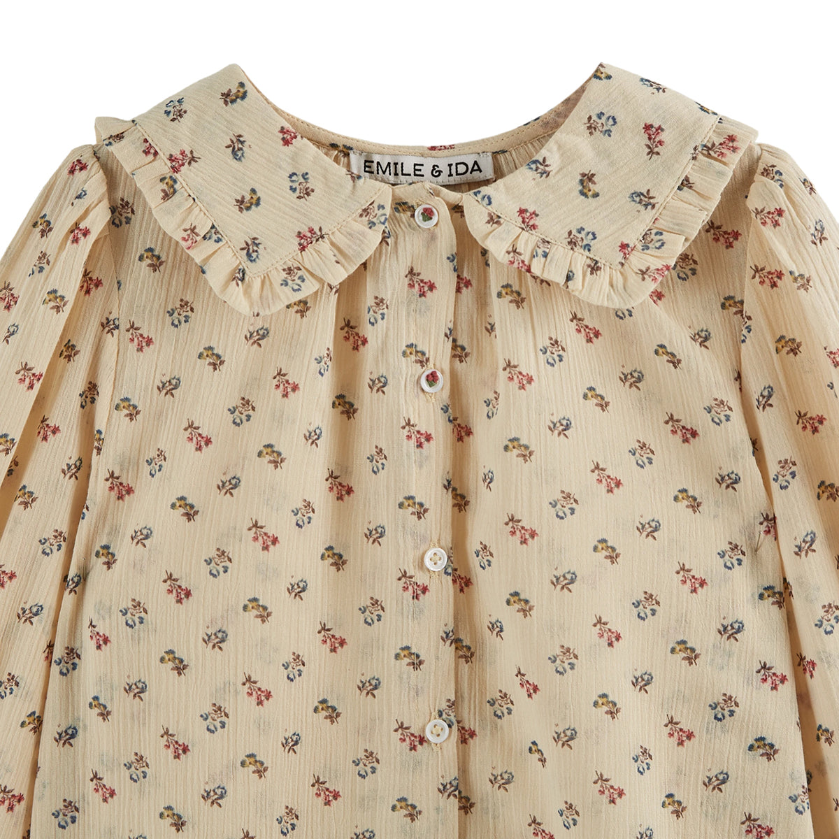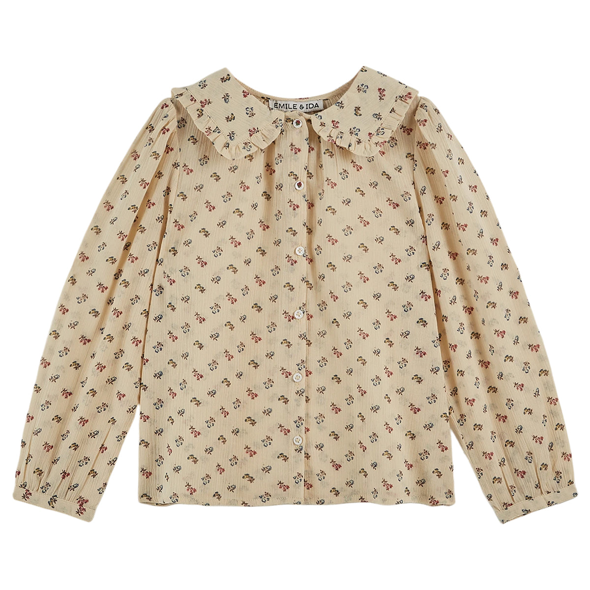 Cotton blouse with an ecru background dotted with pink and blue flowers as regularly aligned as in a French garden from Emile Et Ida. A flared cut whose fullness is reinforced by a few gathers around the neckline, a wide collar inspired by sailor collars and edged with a flounce, long sleeves tightened at the cuffs and, of course, natural mother-of-pearl buttons.