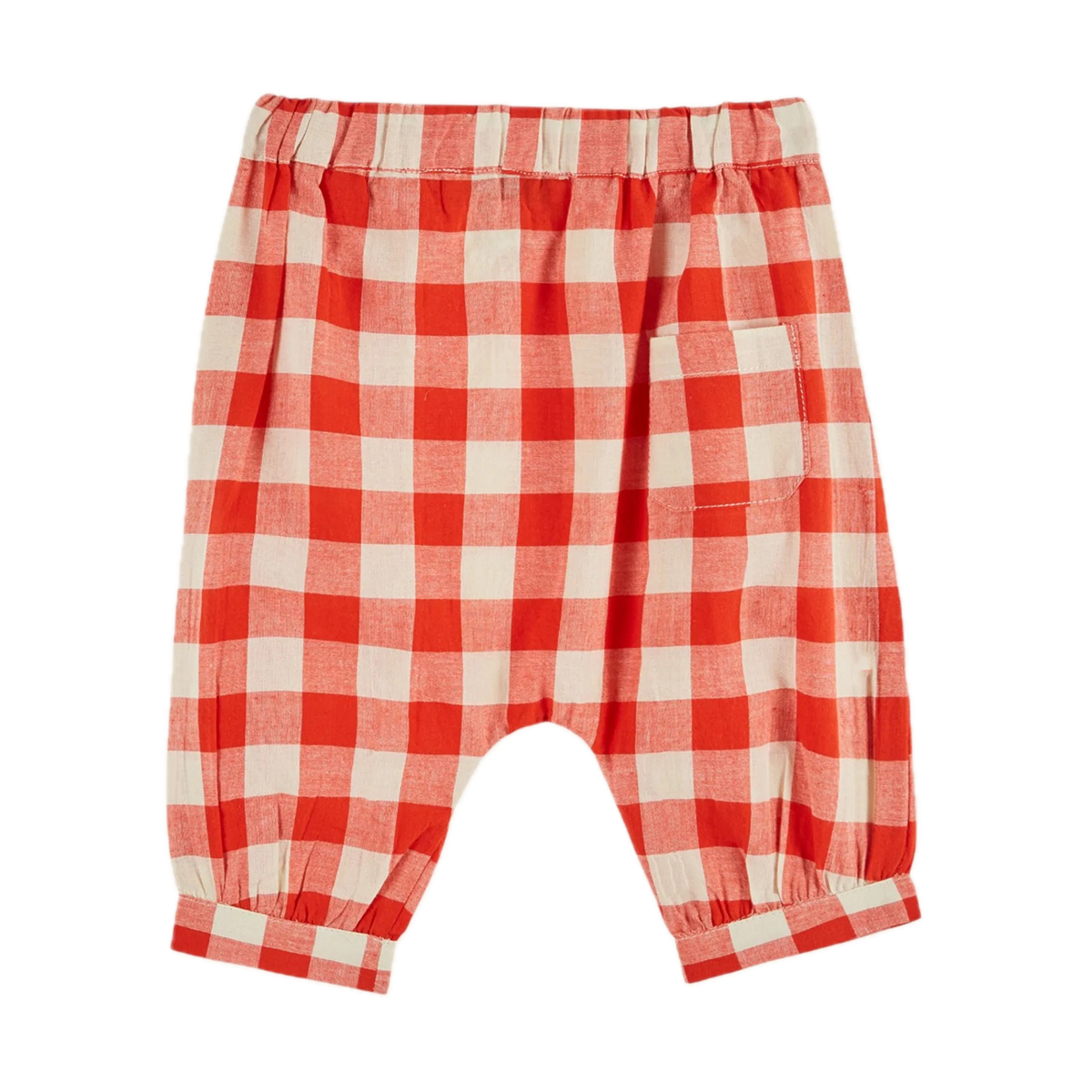 Baby harem pants in gingham organic cotton with large red and ecru checks.