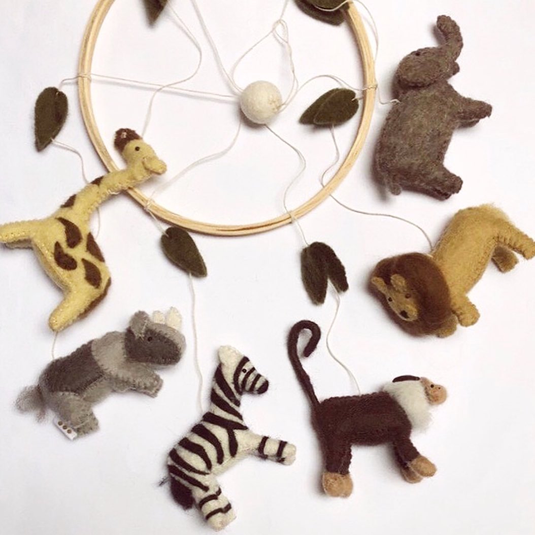 Beautiful and detailed mobile with wild animals. The mobile is beautifully wrapped with a cute ribbon - the perfect gift to a baby shower, birthday or as a maternity gift.