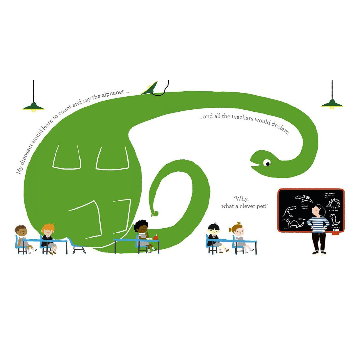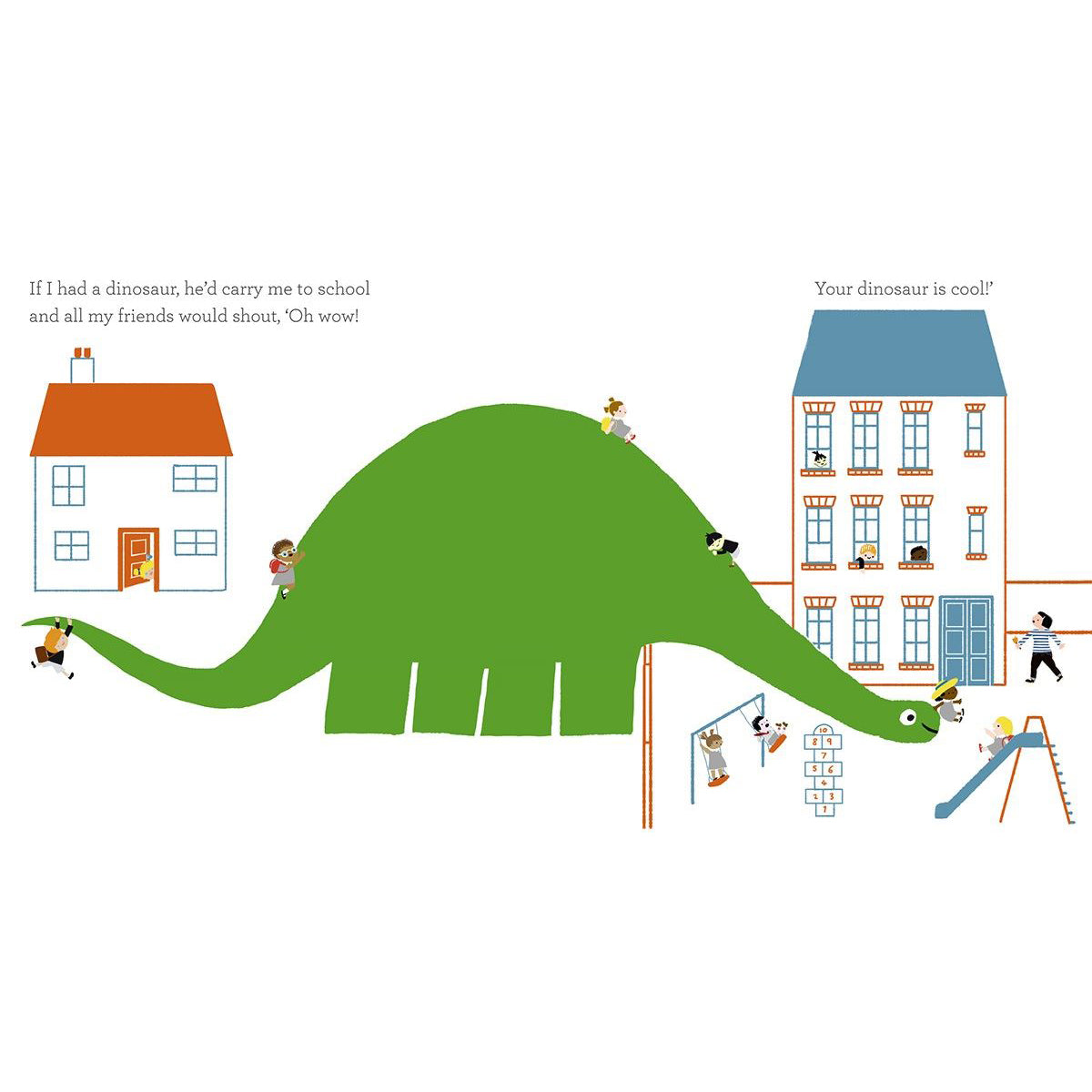 A little girl dreams of having her very own pet. But what kind of animal would make the best companion? A mouse is too small; a cat is too ordinary; and a fish is too... wet! As she plays with her toy dinosaur, inspiration strikes. What If I Had A Dinosaur? At the end of a day spent busily imagining, the girl trudges up to bed with her little plastic dinosaur. As she falls asleep, the dinosaur from her daydreams stands in the garden with its head poking through the bedroom window, making her dreams come true.