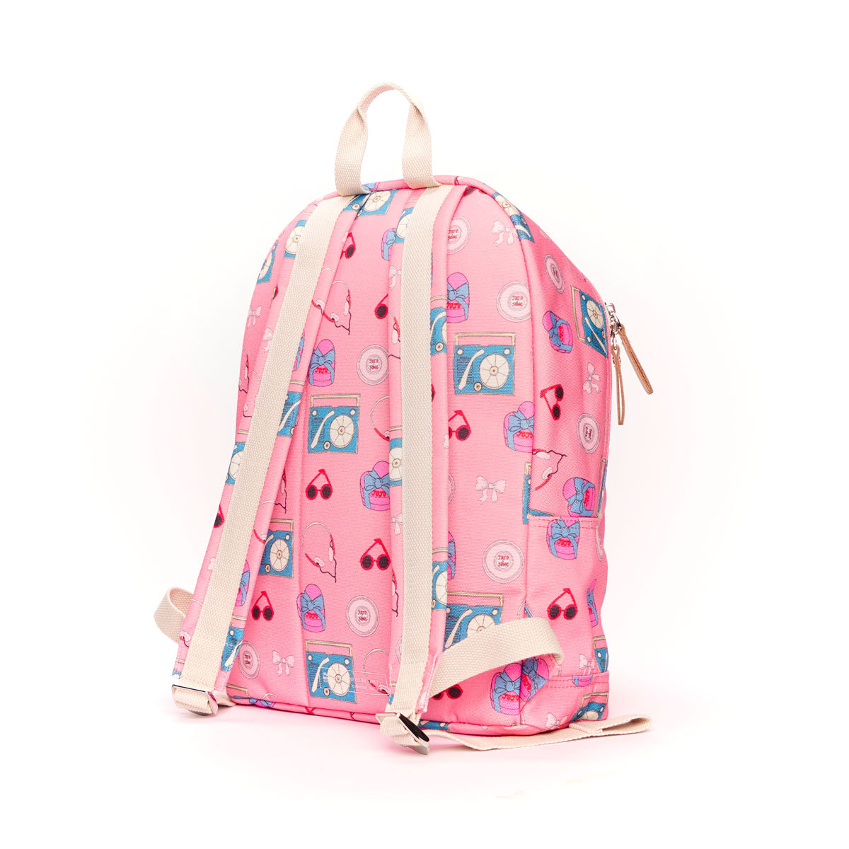 - Wide adjustable padded shoulder straps with metal accessories, small cotton webbing handle