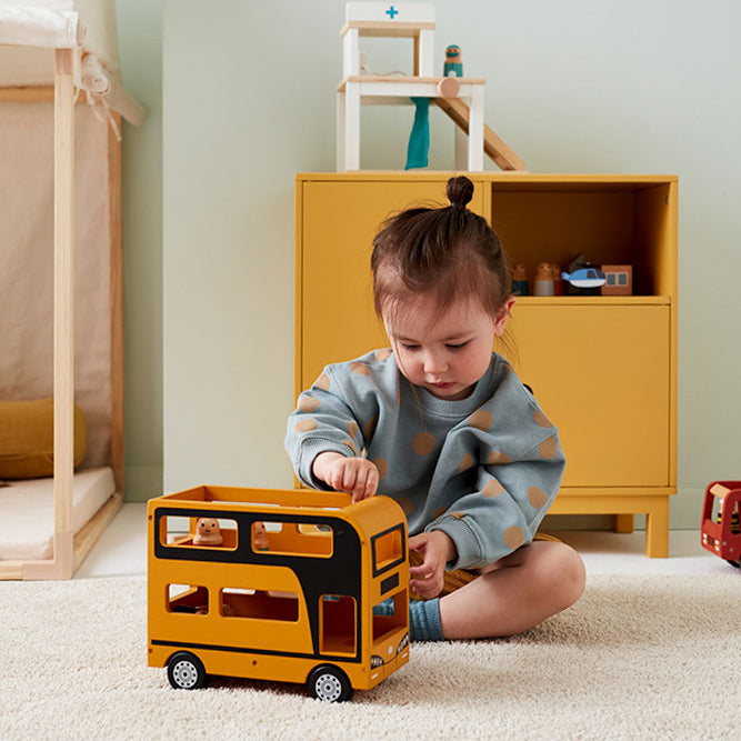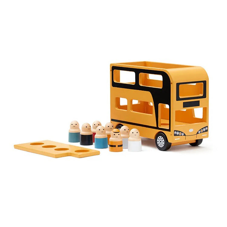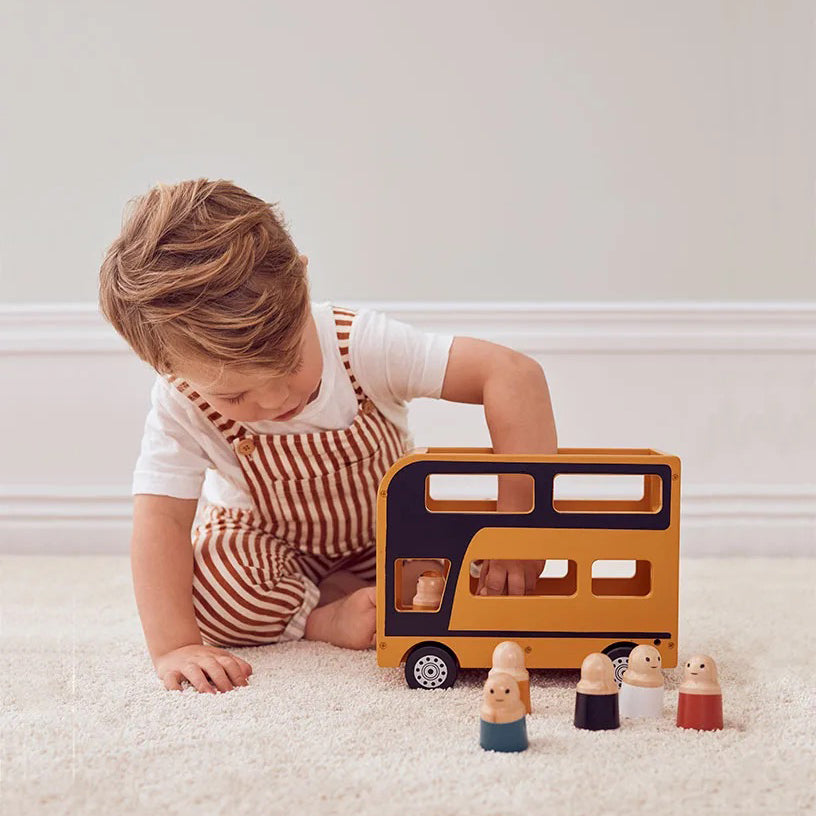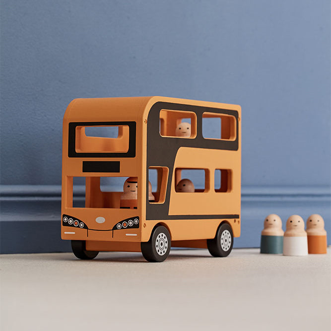 Hop on board! Take a seat on the Kid's Concept double decker around the house. The double decker comes with seven passengers and a bus driver. The floor of the top deck can be removed to take out the figures.