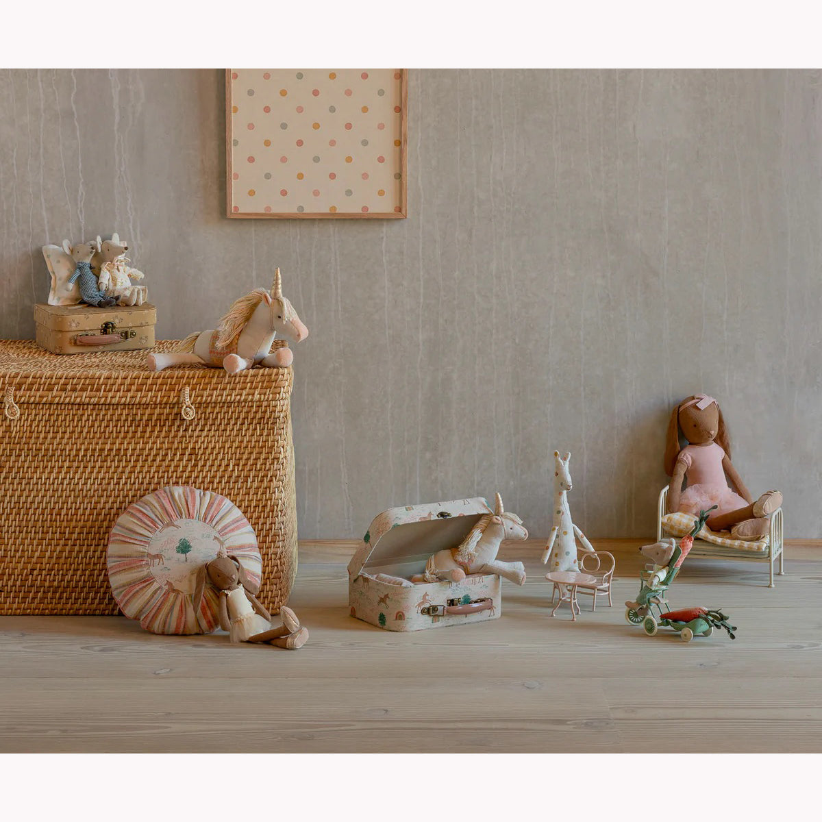A magical story is about to begin. With this unicorn from Maileg made in colourful tones and a golden horn, there are many stories to tell. The unicorn comes with a saddle for a comfortable ride. Fabric may vary.