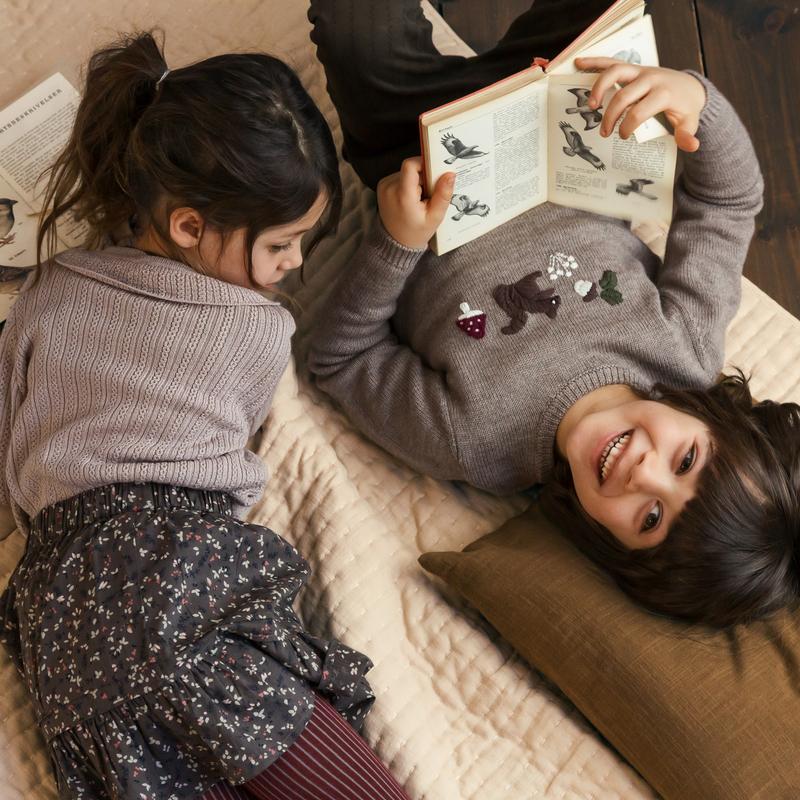 Soft knitted kids sweater with cute embroidery from MarMar Copenhagen. The jumper is knitted in a very soft wool/silk blend and is a perfect addition to a cute Christmas outfit for children. The embroidery features forest animals.