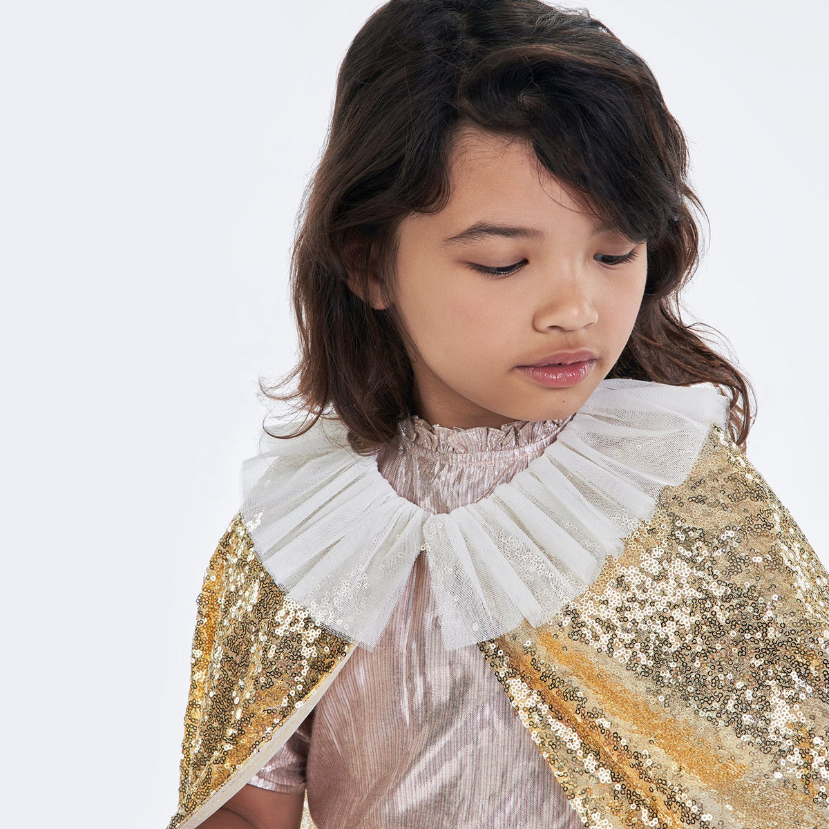 This gorgeous gold sparkle cape costume from Meri Meri is a fabulous way to look extra special for any party or celebration. It's also ideal for imaginative play on any day. It's beautifully crafted from a lined gold sequin fabric, with an elegant white tulle collar. It comes with a gold sequin star wand, perfect to majestically wave around!
