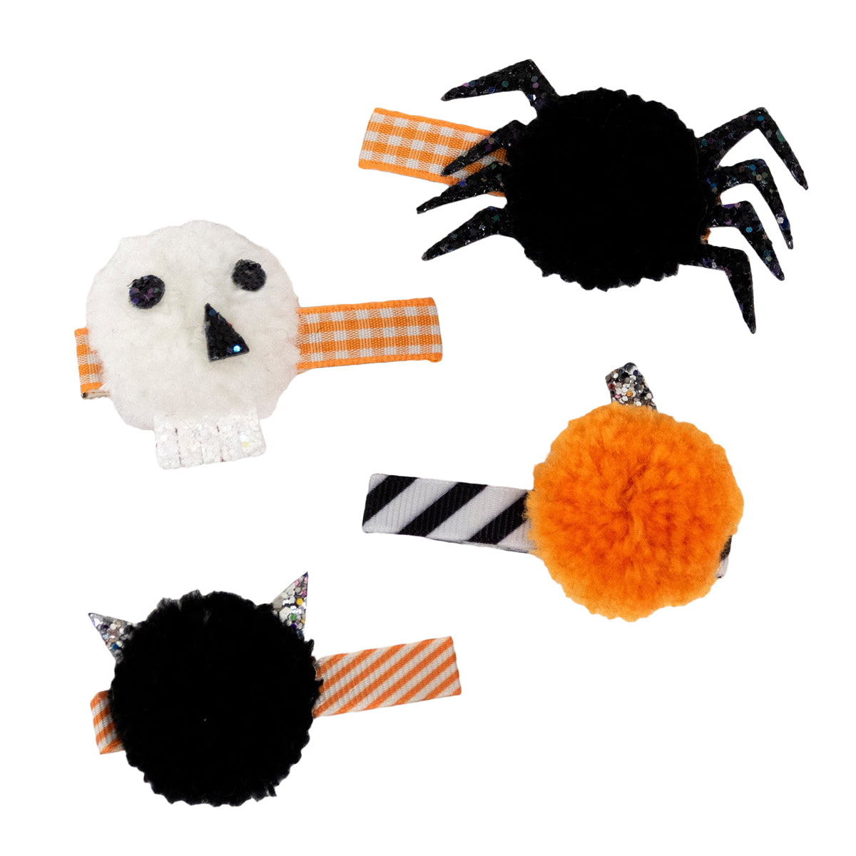 - Each hair clip has a Halloween icon crafted from a pompom, with glitter fabric embellishments