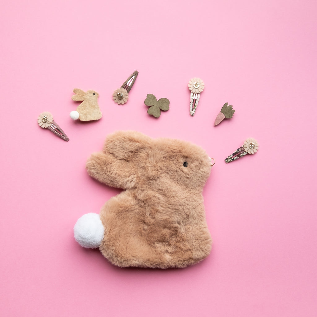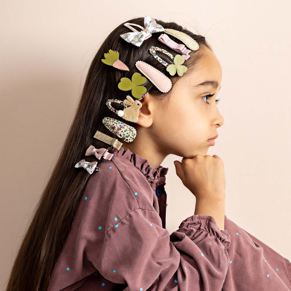 They'll go hopping mad for this super cute set of springtime bunny clips from Mimi & Lula! Three clips including the sweetest little fluffy beige bunny complete with a bright white pom pom tail, an olive green leatherette fabric clover and a soft pink suedette carrot with leatherette leaves, this has got to be the sweetest little springtime clip set you ever did see! Securely fastened to concealed alligator clips, these look super cute worn to the side to add some interest to an everyday outfit and would make a wonderful gift for any little bunny fans!