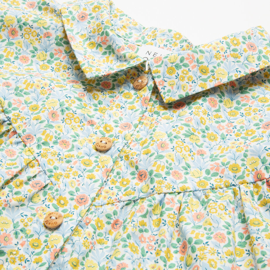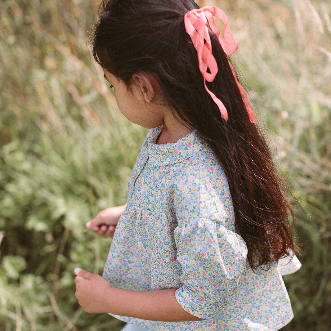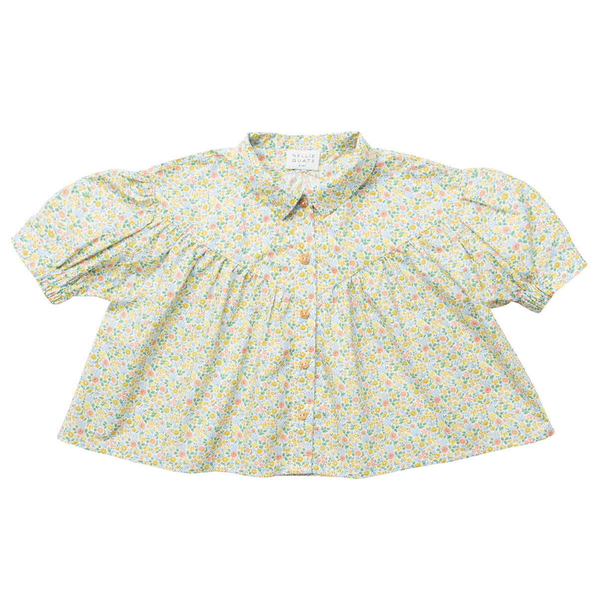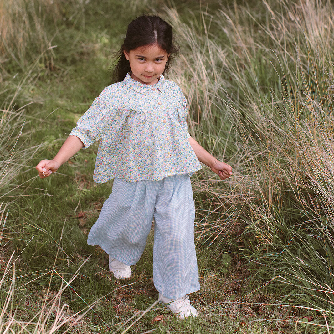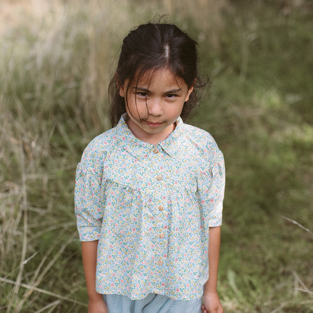 High V-shaped empire line gathers into a loose fit, flowing blouse from Nellie Quats , with medium length puffed sleeves, half fixed, half elasticated cuffs and sweet flat collar. Wooden buttons run down the front of the blouse to open. Made from beautiful Astrid Niva Liberty print cotton. Please note, this is slightly heavier in weight than ultra fine tana lawn cotton.