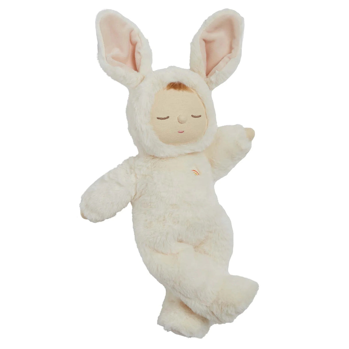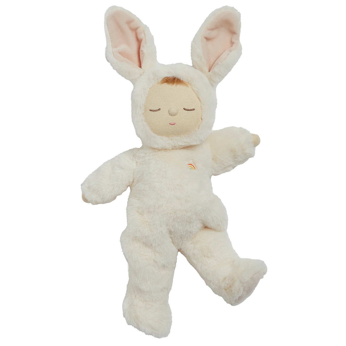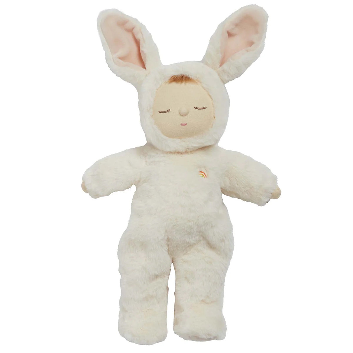 Bunny Moppet is posable, made from the plushest outer and features the sweetest embroidered face with a little tuft of hair. Each Cozy Dinkum wears a non-removable suit with two soft furry ears and a rainbow right over their heart.