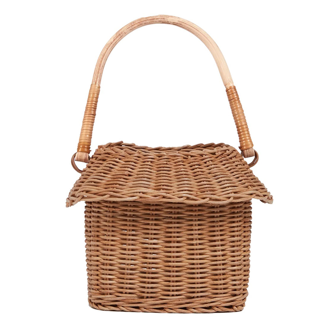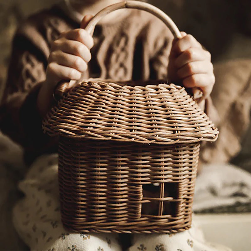 A handmade rattan hutch small house from Ollie Ella that travels with you wherever you go. Featuring a woven body, sturdy rattan handle, and the sweetest window opening, this basket is designed to carry all things small and precious!