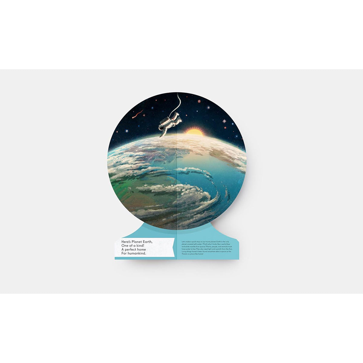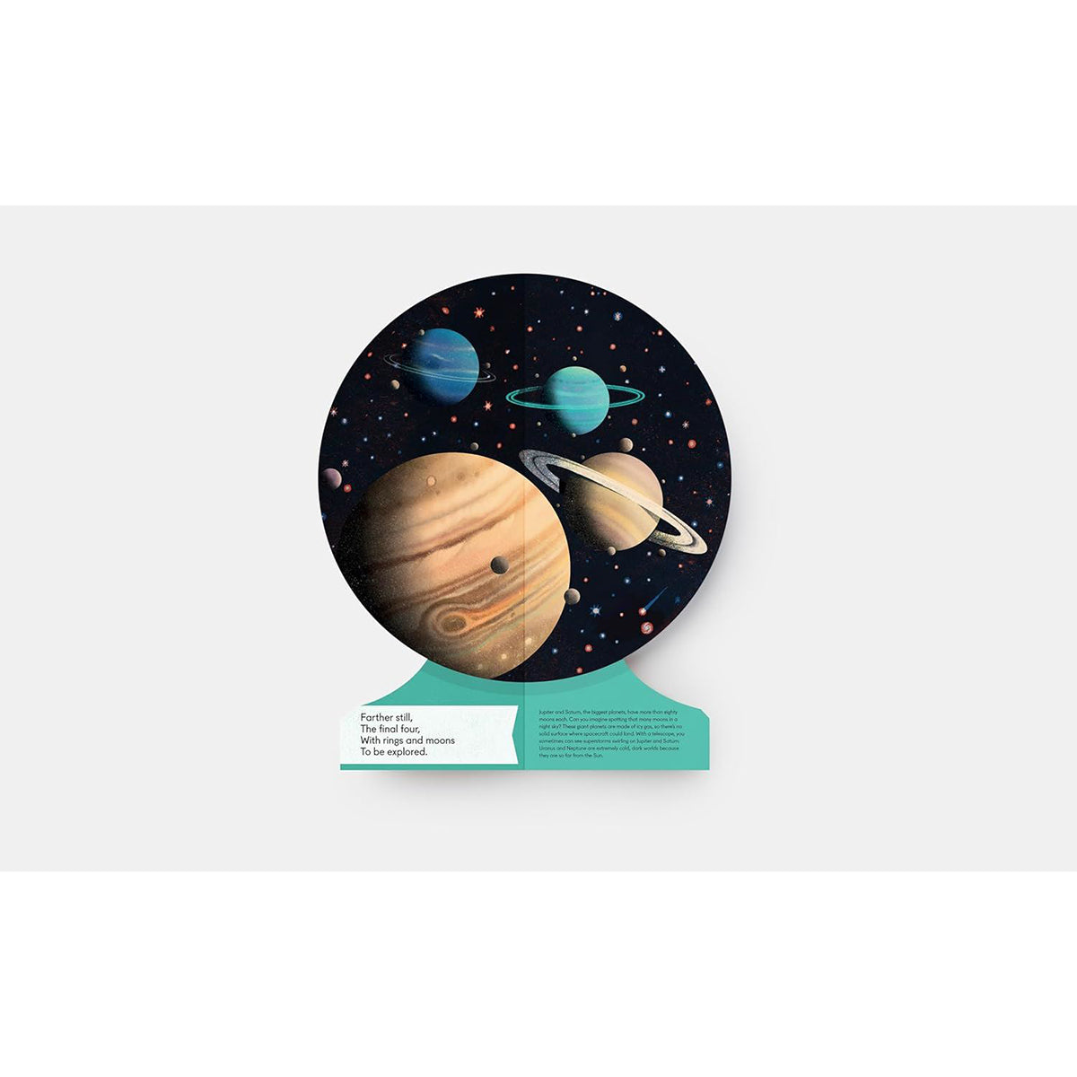 A read-aloud introduction to space for readers aged 2-5 years. When opened and folded back, the book creates a freestanding galactic globe, fastened by a magnetic closure. Children are invited to explore space through rhyming verse and colour illustrations. Subjects include the Moon and the Sun, the eight planets in our solar system, asteroids and stars, and our own galaxy. Secondary text offers more detailed information, encouraging readers to learn not only about celestial objects but rockets, rovers, and other space technologies.