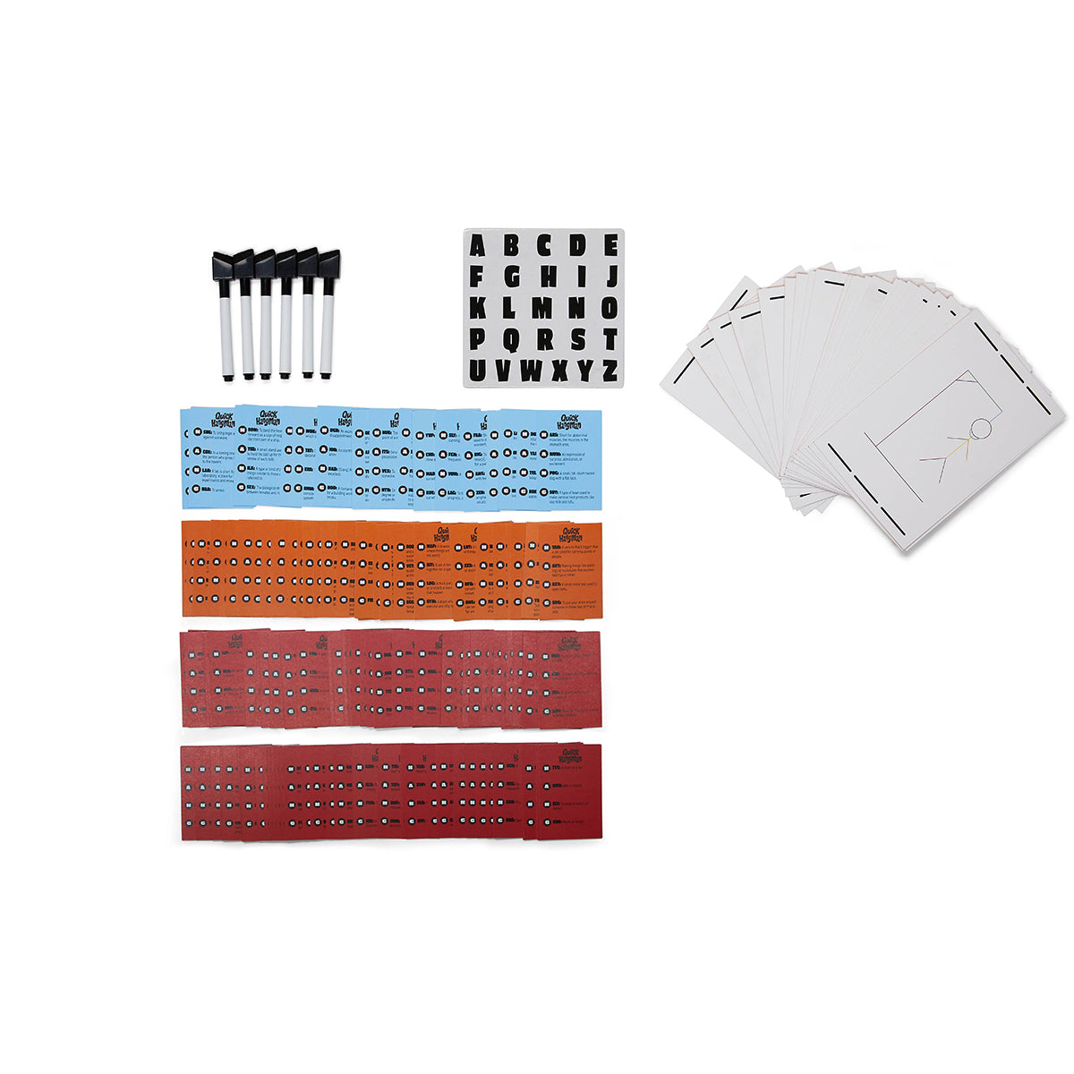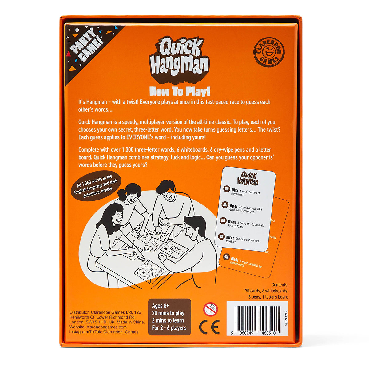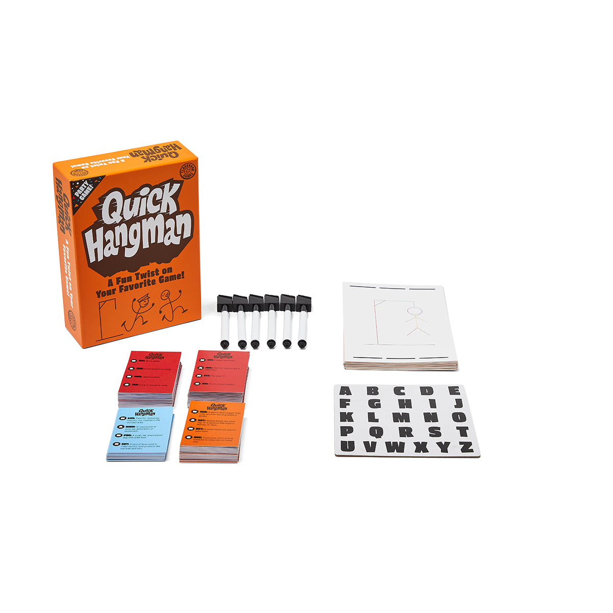 Draw a card to determine your three-letter secret word. Everyone takes turns calling out any letter that they think might be in another person’s word. If the letter is in your word, write it down on your Hangman Card. If it isn't, you can draw a line on your Hangman. Players can when one of three things happen: if someone suggests the last missing letter of someone's word, if someone guesses another player's whole word, or if you are able to complete your own hangman drawing.
