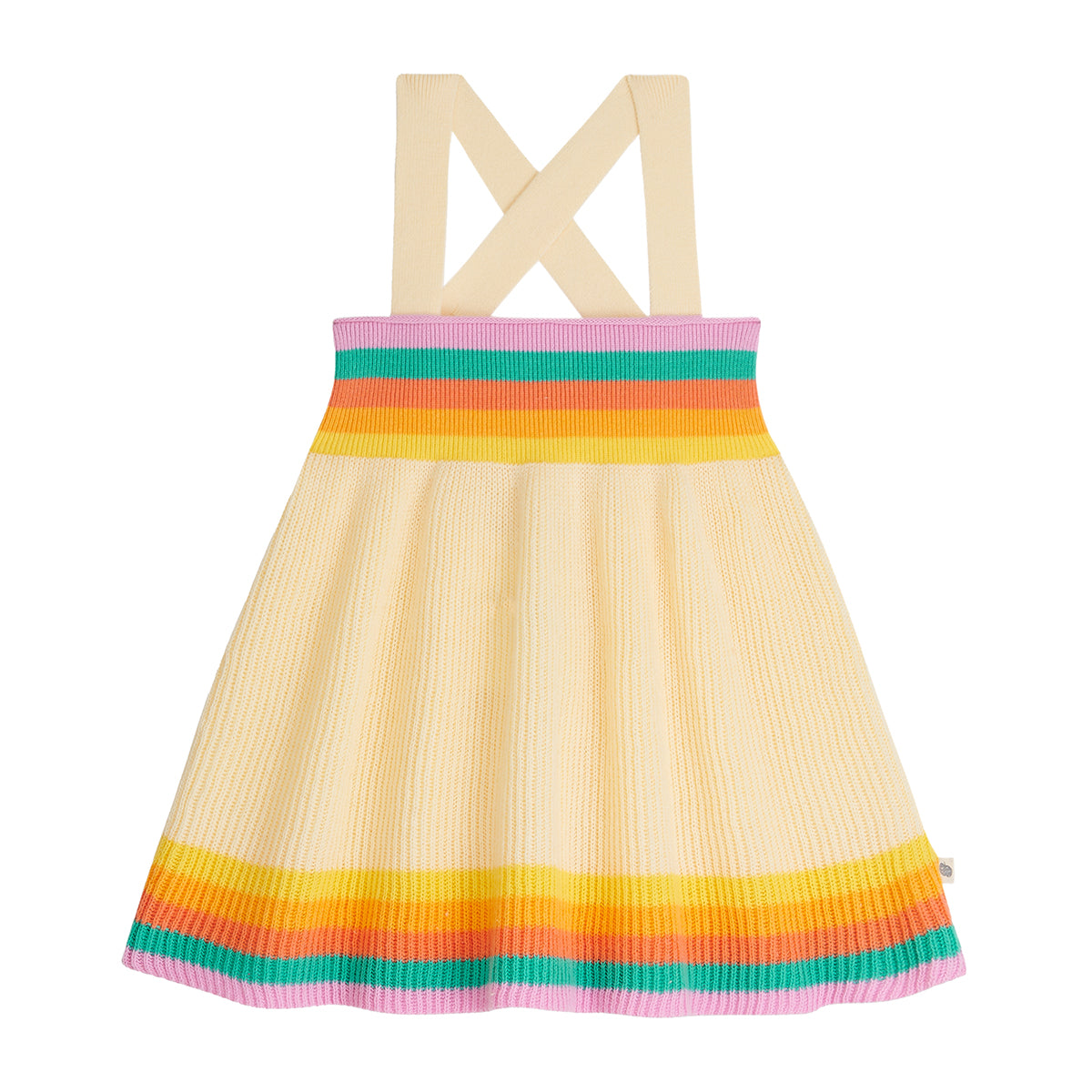 Get twirling in this organic cotton rainbow and cream summer dress from The Bonnie Mob, adding a burst of vibrant colours to your little one’s wardrobe. Adjustable cross back straps for longer wear and a soft lightweight knit for summer, or layer with a t-shirt in spring. Crafted with the utmost care in a GOTS certified factory and designed to pair with bonnie mob outfits in this season and beyond.