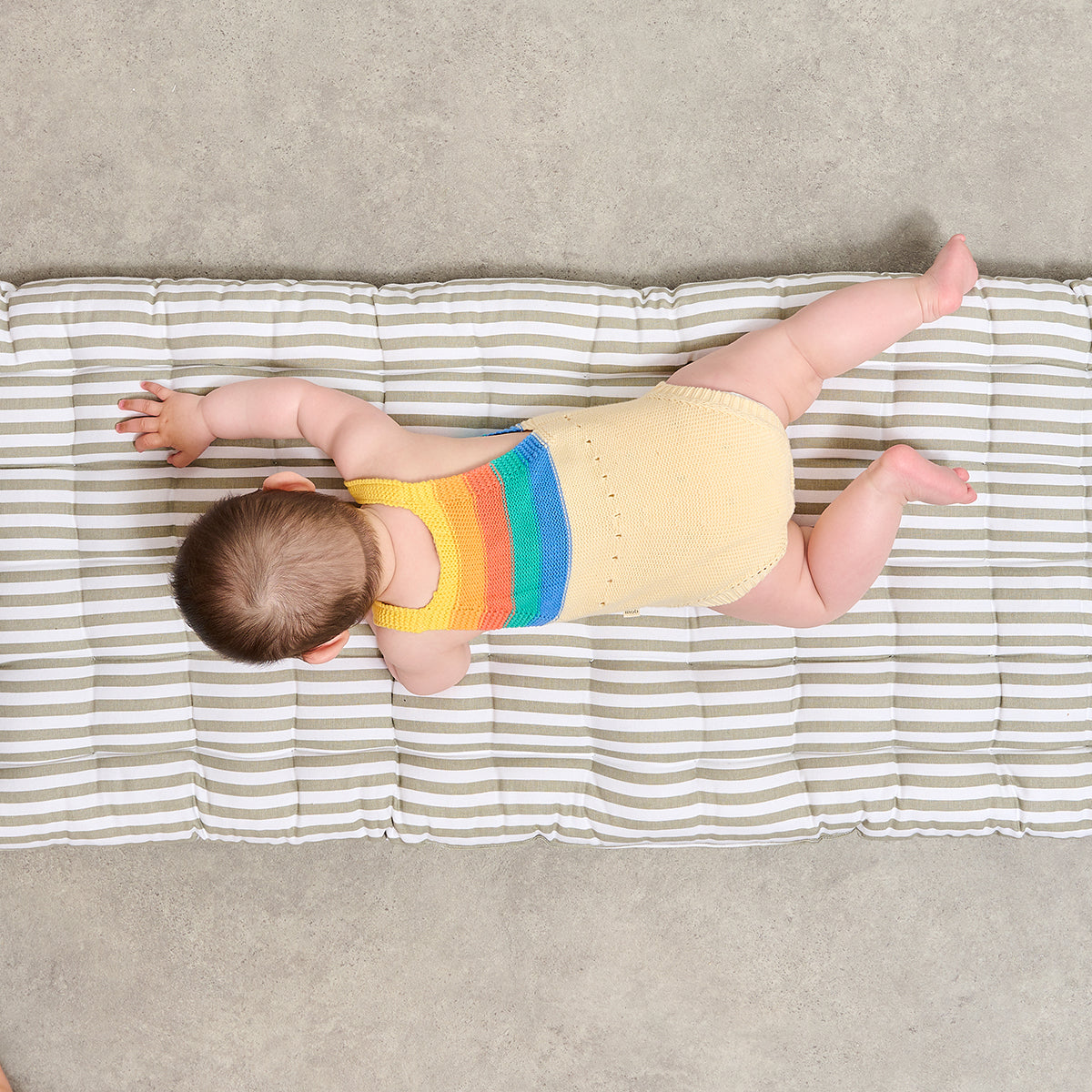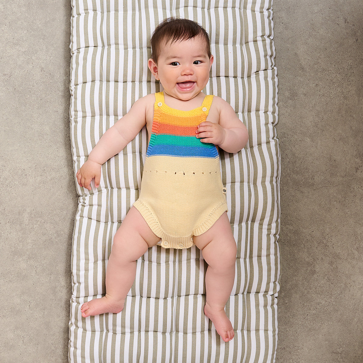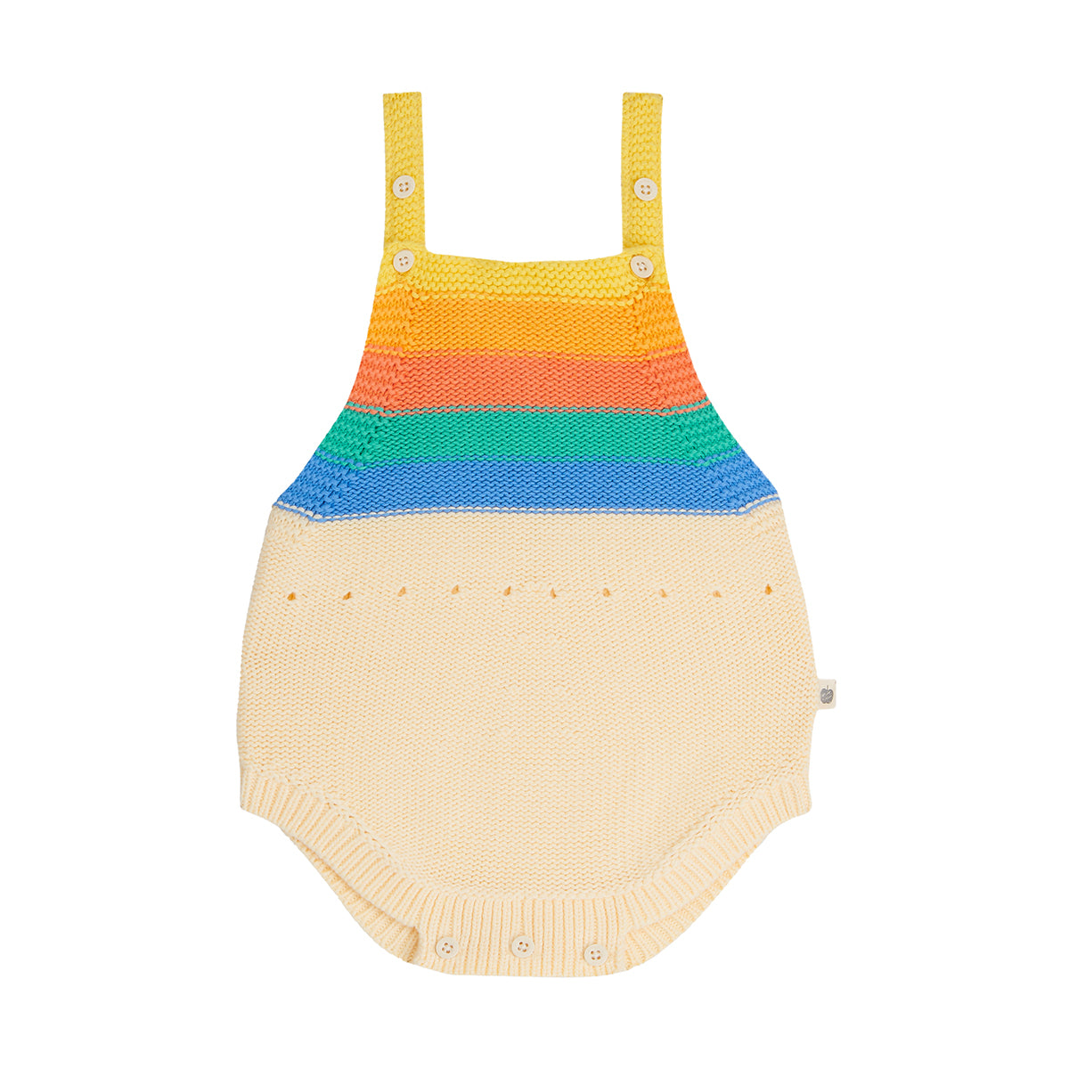 Adorable summer baby bubble romper from The Bonnie Mob. Sustainably knitted with unisex rainbow stripes, this adorable shape has been crafted with care from organic cotton in a GOTS certified factory. The adjustable buttoned straps ensure a perfect fit, adapting as your baby grows. Effortless dressing with tiny buttons at the crotch. Perfect for layering in Spring and ideal for high Summer. An heirloom-worthy baby outfit or gift.