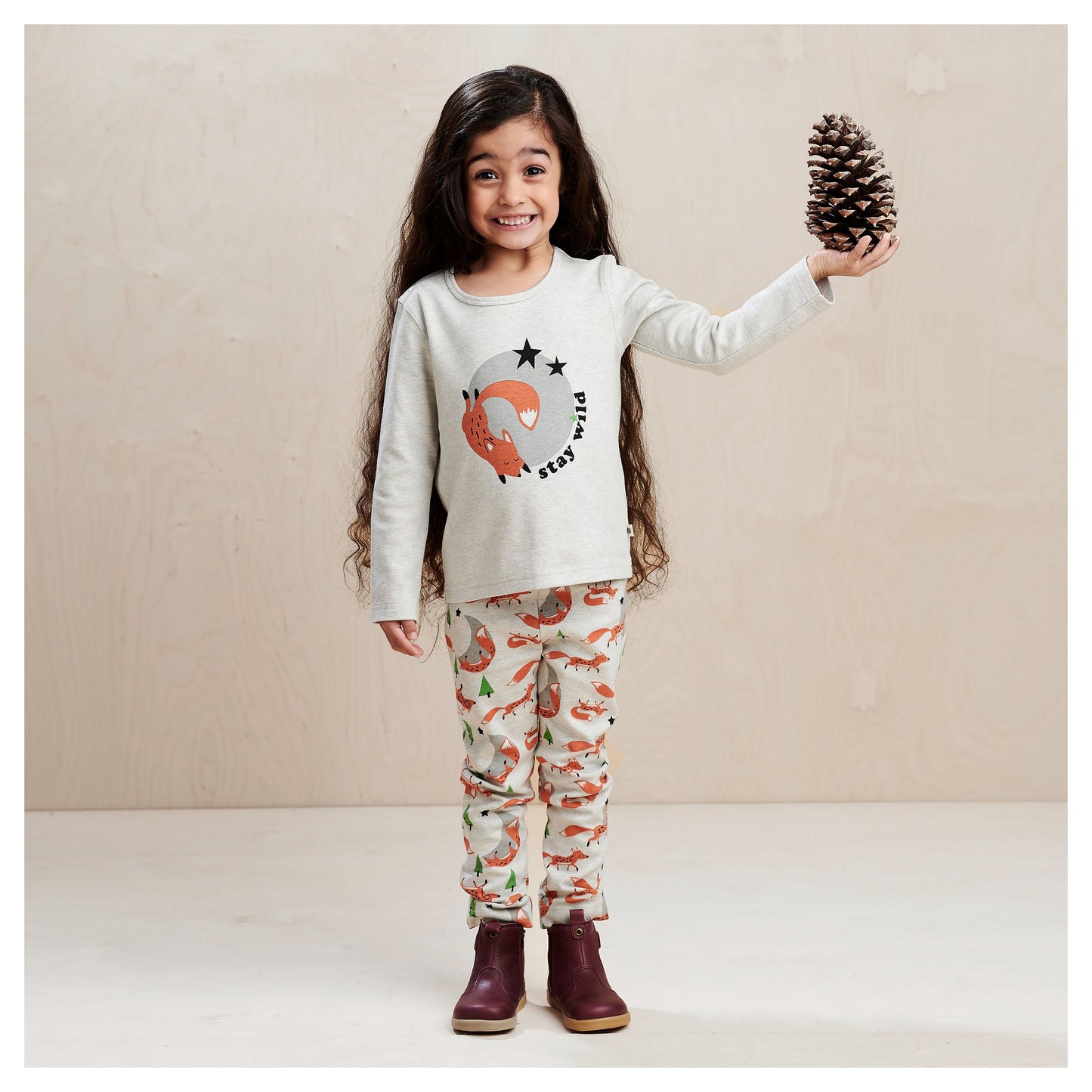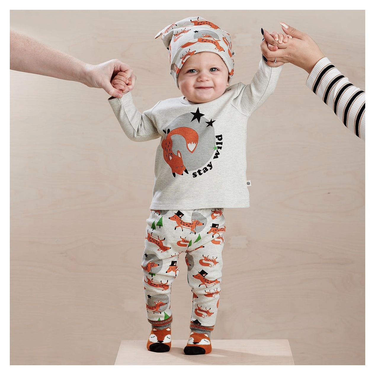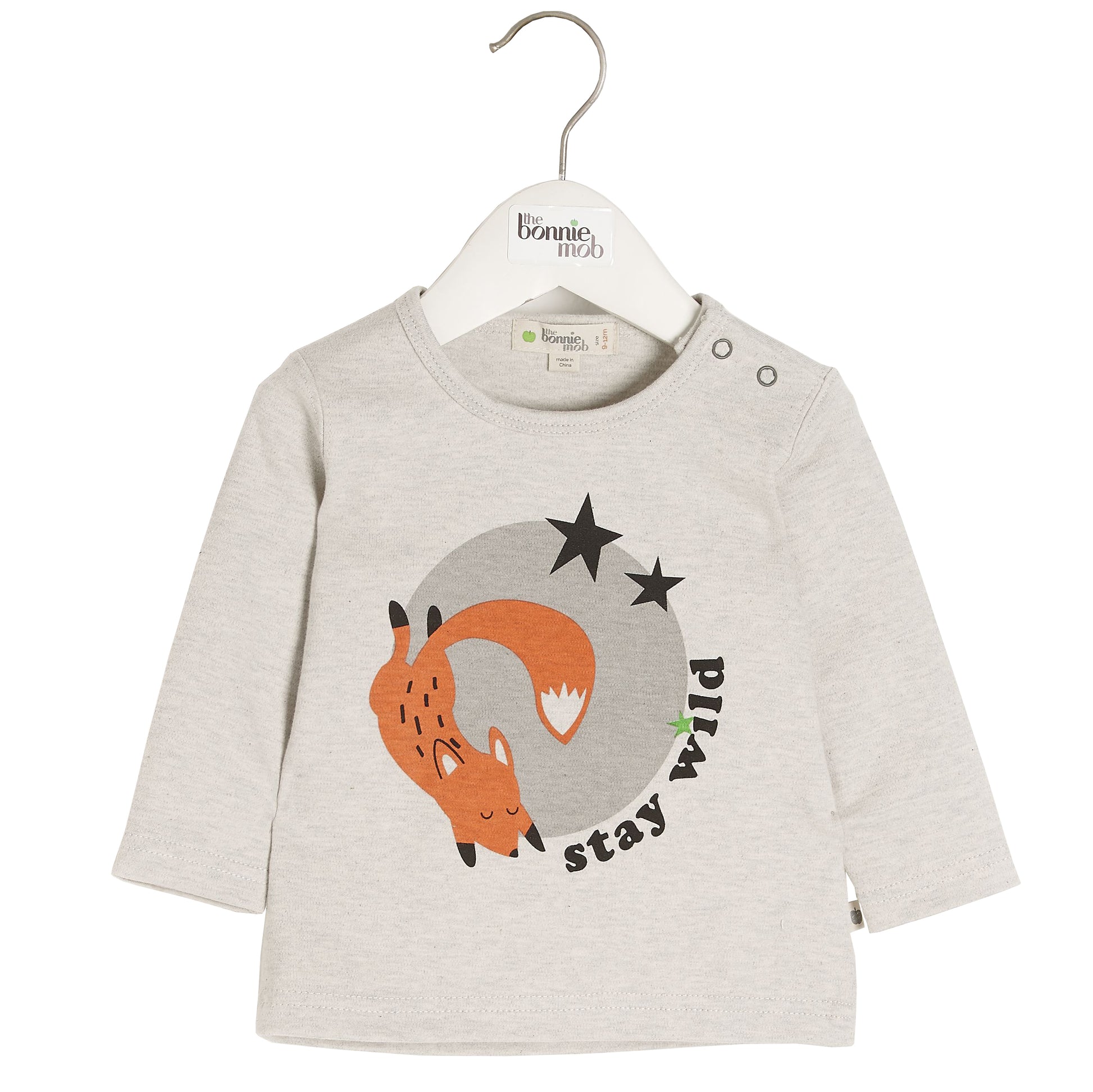 A super soft and gentle, long-sleeved baby t-shirt with shoulder press stud opening for easy dressing. The fabric is brushed on the inside for extra winter coziness and softness against delicate skin. The design features a fantastic flying fox, encouraging little ones to 'stay wild' and pairs perfectly with the fox print trousers, leggings, and hats for a sweet unisex baby outfit.
