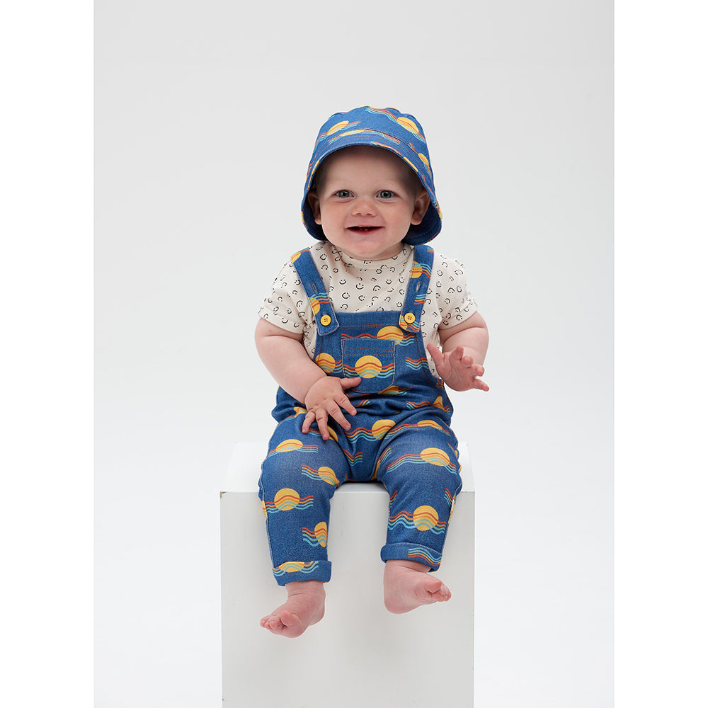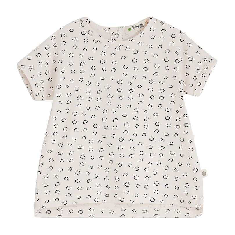 Short-sleeved baby and toddler t-shirt with a monochrome smiley print from The Bonnie Mob. The GOTS certified organic cotton and the relaxed fit makes it very comfortable for little ones to wear. The top is designed in a kimono t-shirt style with a slightly longer back than the front and rolled back sleeves. It comes with press studs (on sizes 0-24M) to make dressing easier. Pair the unisex baby tee with matching accessories and a nice pair of trousers or shorts for a sustainable summer outfit.