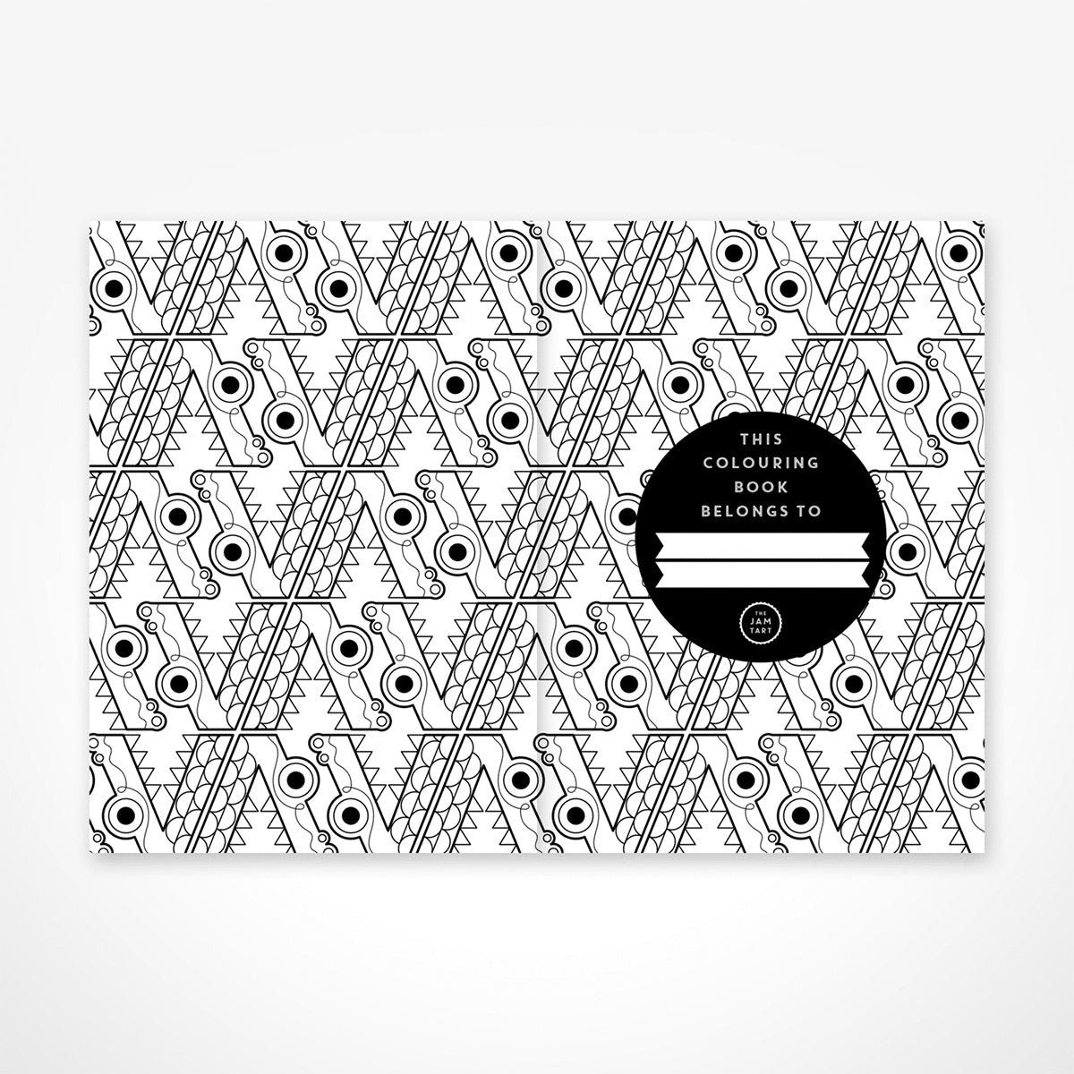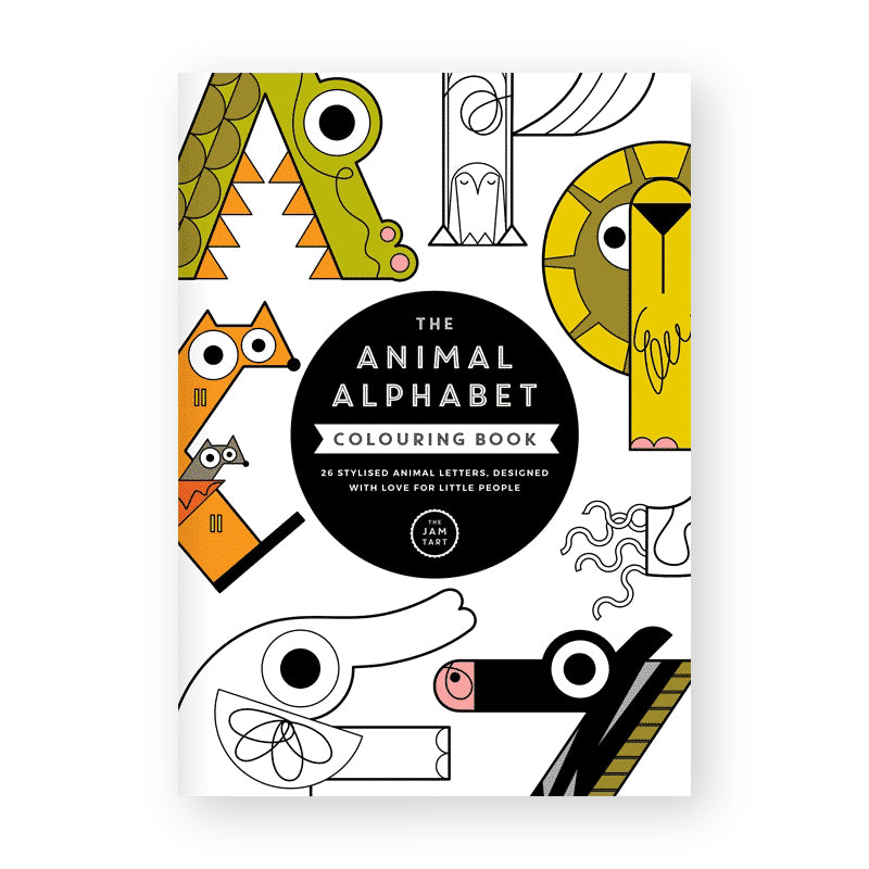Colour and identify the animal ‘hidden’ within each letter. The 32 page colouring book from The Jam Tart features 26 stylised animal letters and a supporting sentence for example ‘A is for Alligator’. Patterned end papers and a ‘this book belongs to’ illustration completes the book design.