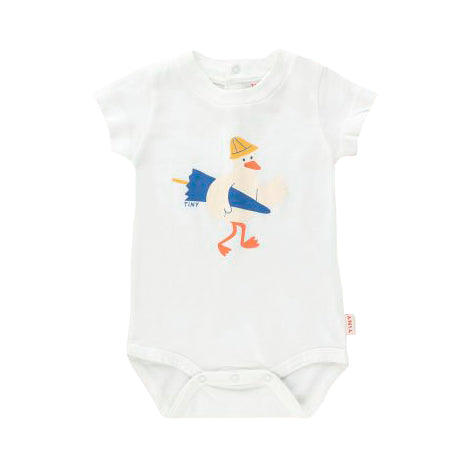 Splashing along the dancing waves by the Mediterranean shore. A restless beach goose under the tiny Ionian sun! This off-white base body with a colourful print from Tiny Cottons comes in a short sleeve style with round neckline, back opening and snap buttons on the crotch for easy dressing and diapering. The composition of this body is organic cotton, to ensure an earth-friendly product and to provide maximum comfort.