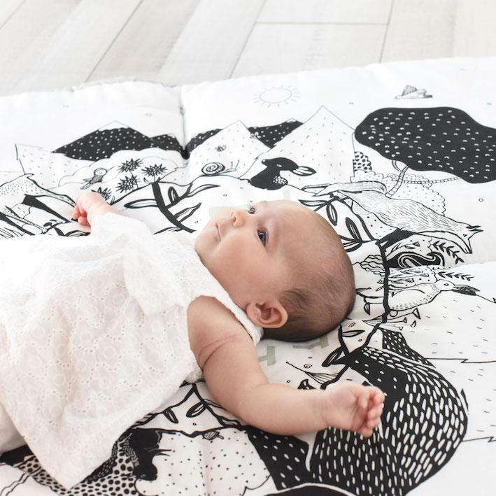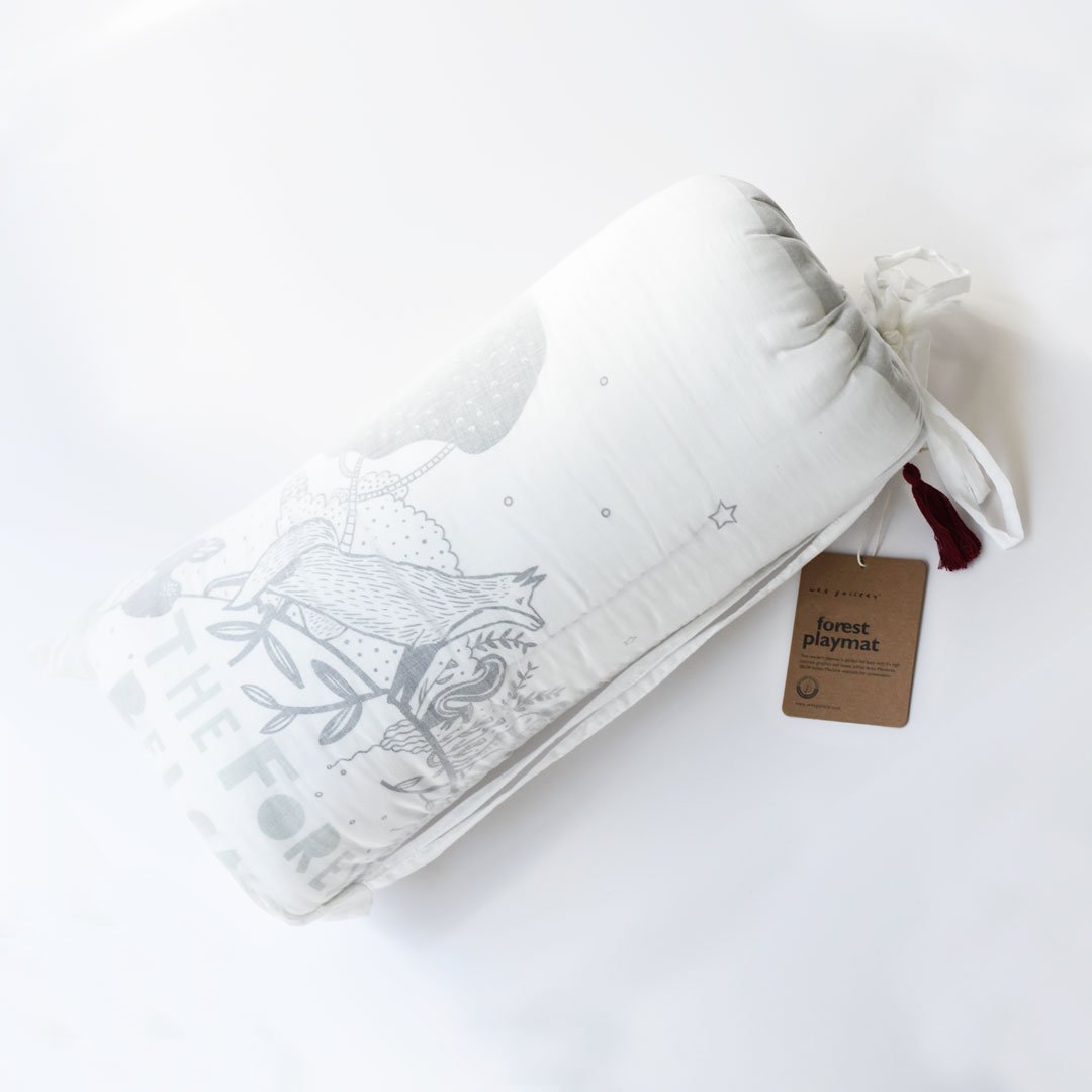 This reversible playmat features friendly forest animals on one side and a lovely forest pattern on the other. Made in India using organic traditional fabrics. The outer fabric is a double layer of organic voile making it super soft and Poly-Fil makes it machine washable for convenience. Its high contrast graphics make it ideal as a playmat. The reversible two-sided pattern keeps it interesting for baby. Packaged in a fabric drawstring bag with tassel.